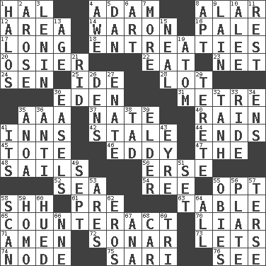 ACROSS 1. Actor Linden 4. First of billions? 8. Having or resembling wings 12. Length times width 14. Make _____ (do battle with) 16. Light colored 17. Having great length 18. Pleas 20. Flexible twig of a willow tree 22. Ingest 23. Fish or hair follower 24. Elected rep. 25. Binary compound 28. Car dealer's back yard 30. Paradise 31. Distance measurement (Brit.) 35. Auto club (abbr.) 37. Nathan's nickname 40. Water falling in drops from the sky 41. Taverns 42. Lacking originality or spontaneity 44. Extremities 45. Haul 46. Whirlpool 47. Definite Article 48. Travel by water 50. Celtic language 52. Ocean 54. To separate or throw off 55. Elect 58. Quiet! 61. Before (prefix) 63. Eating place 65. Act in opposition 70. One who doesn't tell the truth 71. So be it 72. Echolocation 73. Allows 74. Thickened enlargement 75. Indian skirt 76. Perceive with the eye DOWN 1. Saint headwear 2. Came up 3. Soviet premier 1918-24 4. Deep reverence 5. Daniel's nick name 6. Nonscientific branch of learning 7. Greater amount 8. Fitting 9. (Had) reclined 10. Toward shelter 11. Repose 13. Mature 15. Be tempered by heat 19. Smallest unit of an element 21. To free from 26. Cub Scout units 27. Maternal 29. Cylindrical with tapered ends 30. Artist's stands 32. Hyperbolic tangent 33. Travel on an animal 34. Followers of ems 35. Small Philippine buffalo 36. Opposed to 38. Small boy 39. A person who is older than you are 41. ___ a Wonderful Life 43. Jane of fiction 49. Back-to-school mo. 51. Arrange properly for use 53. Ancient Greek god of war 55. Off-Broadway awards 56. Food holder 57. Laconic 58. Examine hastily 59. Like (prefix) 60. Took on color 62. Greek god of love 64. 100% 66. Compass dir. 67. Santa ___, CA 68. Auto 69. Three (prefix)