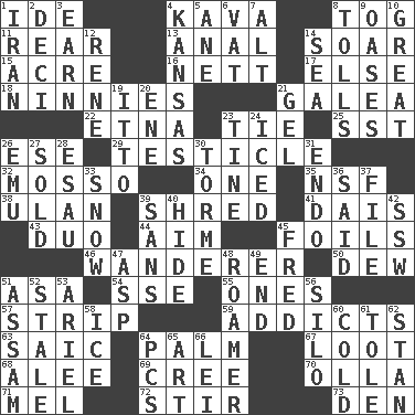 ACROSS 1. Binary compound 4. Polynesian shrub of the pepper family 8. Coat; cloak 11. Located in or toward the back 13. Of or related to the anus 14. Fly high 15. Land measure 16. Remaining after all deductions 17. Otherwise 18. Fools 21. An organ shaped like a helmet 22. Inactive volcano in Sicily 23. Neckwear 25. Fast jet (abbr.) 26. Compass dir. 29. One of the two male reproductive glands 32. With motion or animation 34. Single 35. Science/research agcy. 38. ____ Bator 39. Tear up 41. Raised platform 43. Superhero pair 44. Direct toward a target or goal 45. Fencing necessities 46. Nomad 50. Morning condensation 51. White ___ sheet 54. Compass dir. 55. Singles 57. Remove all contents or possession from 59. Inveterate users 63. Ketch in the Levant 64. Inside of hand 67. Plunder 68. Toward shelter 69. Algonquian 70. Spanish pot 71. Cartoonist voice _ Blanc 72. Move through with a circular motion 73. Lair DOWN 1. SW Asia republic 2. Tenth: prefix 3. Merit 4. Sunflower state 5. One (Scot) 6. Large container 7. The first octave above the treble staff 8. For Whom the Bell _____ 9. Fertile tracts in a desert 10. Relatively large 12. French philosopher Descartes 14. Ocean 19. "Tell ____ the Marines!" 20. Compass dir. 21. Set 23. Prong on a fork 24. On the rocks 26. Australian flightless bird 27. Exchanged or delivered for money 28. Son of Isaac 30. Singer Mel 31. Inside; within (prefix) 33. Frozen precipitation 36. Alleged 37. Do some clerical work 39. Without 40. Flintstone garb 42. Compass dir. 45. Flintstone 47. Cleo's killer 48. Nomad 49. Conclusion 51. Indian state 52. Showing deterioration from age 53. Satellite of Uranus 56. Grain storage tower 58. Frozen water 60. Having a low temperature 61. Lacquered or enameled metalware 62. Comedian Laurel of Laurel & Hardy 64. Personal Computers (abbr.) 65. Tate display 66. Luau accessory
