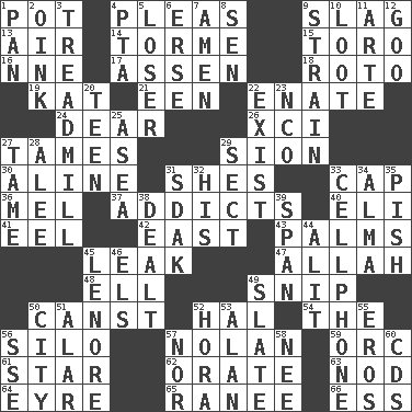 ACROSS 1. Cooking vessel 4. Entreaties 9. Volcanic refuse 13. Wind 14. Singer Mel 15. "Corrida" creature 16. Compass dir. 17. NE Netherlands city 18. Printing process, for short 19. Krazy ___ of comics 21. Car or cant ending 22. Related on the mother's side 24. Letter starter 26. One more than ninety 27. Softens 29. The Jewish people; Israel 30. Place in a line 31. "______ My Girl" (Turtles hit) 33. Head covering 36. Cartoonist voice _ Blanc 37. Inveterate users 40. Biblical high priest 41. Snakelike fish 42. 90 degrees 43. Insides of hands 45. Path through which fluid escapes 47. Assad's deity 48. Pipe bend 49. Sever or remove by pinching or nipping 50. 2nd pers. sing. pres. of can (arch.) 52. Actor Linden 54. Definite Article 56. Grain storage tower 57. Pitcher Ryan 59. The grampus (Milton) 61. Play the lead 62. Speak pompously 63. Dreamland 64. Jane of fiction 65. Indian princess (variant) 66. Double-curved letter DOWN 1. Baking dish 2. Pig sound 3. Excercise machine 4. Parent Teacher Assoc. 5. Failure 6. Celtic language 7. So be it 8. Elected rep. 9. Put through a sieve 10. Plunder 11. Johnson of "Laugh-In" 12. Thick or sticky substance 20. Adolescent 22. Have an existence 23. Non-commissioned officer (abbr.) 25. Toward the sea 27. Docile 28. Toward shelter 29. Religious group 31. Neighbor of Neb. 32. Part of HMS, perhaps 33. Portable communications device 34. _ mater 35. Expression of disdain 38. Started a card game 39. Connect, as a bridge 44. Set down 45. Poe poem 46. Raised railways 49. Schedule 50. Municipality 51. Having or resembling wings 52. Israeli folk dance 53. Actor Alda or Thicke 55. Greek god of love 56. Compass dir. 57. And not 58. Born 60. Music discs