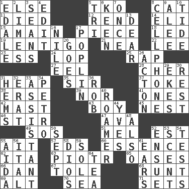ACROSS 1. Otherwise 5. Ring climax 8. Domesticated feline 11. Passed on 12. Tear apart 14. Biblical high priest 15. With great haste 17. Part 18. Directed 19. Small, flat, pigmented spot on the skin 21. Teachers' org. 22. Area sheltered from the wind 23. Double-curved letter 24. Trim (branches) 25. Strike 27. Snakelike fish 28. "Mermaids" star 31. Pile 35. Title for a knight 37. Casino tip 38. Celtic language 39. Not either 41. Singles 42. Vertical spar for supporting sails 43. Male child 45. Egg locale 46. Use a swizzle stick 47. Actress Gardner 49. Distress signal 51. Cartoonist voice _ Blanc 52. Eastern Standard Time (abbr.) 55. Small island 57. Begley and Asner 60. Center 62. Call ___ day 63. Peter (Polish) 65. Fertile tracts in a desert 66. Daniel's nick name 67. Lacquered or enameled metalware 68. The smallest animal of a litter 69. The first octave above the treble staff 70. Ocean 71. Puts into a specified state DOWN 1. Peak District village in England 2. Citrus fruits 3. Actors Connery and Penn 4. Prepare for publication 5. Three (prefix) 6. Peachy ____! 7. Single time 8. Portable communications device 9. Toward shelter 10. Event that recurs at intervals 13. Letter starter 16. "Death on the ____" 17. Cotton for raincoats, e.g. 20. Moves 26. NE Massachussets city 29. Supplements with great effort 30. Take ten 31. Cloth borders 32. Part of Q.E.F. 33. Helper 34. Stone: prefix 36. Director Reiner 40. Wanderer 44. Jacques Cousteau's middle name 48. In addition 50. Back-to-school mo. 52. Follow as a consequence or result 53. Odor 54. Trials 55. Opera by Verdi 56. Slanted text style (abbr.) 58. "Vaya con ____" 59. Flatfish 61. Hearing organs 64. Afternoon social gathering