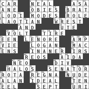ACROSS 1. Auto 4. Be tempered by heat 8. White ___ sheet 11. A saturated hydrocarbon 12. Off-Broadway awards 14. Naughty child 15. Farming town in central California 17. Methods 18. Hero or heavy, e.g. 19. Of or relating to Laos or its people 21. Obtain by seizing forcibly or violently 23. Added to 24. Shoshoni 25. Electrical Unit 27. Become fatigued 30. Car or cant ending 31. Poe poem 34. Electrical Unit 37. Compete 38. Utah city north of Ogden 39. Big _ 40. Followers of ems 41. More lacking in sense or substance 43. Big collection agency 44. Vintage cars 45. Opera by Verdi 47. Modern: prefix 49. HTML Container Element 50. Saint headwear 52. Legislator 56. Roll call or roster of names 57. Canadian anthropologist Darnell 60. Unadorned 61. ____ Jay Lerner 62. Perfect 63. "___ Little Indians" 64. Snakelike fish 65. Back-to-school mo. 66. RI univ. DOWN 1. Give a ring to 2. Small Philippine buffalo 3. Do over again 4. Roamer 5. Inky black, to poets 6. Assist 7. Area sheltered from the wind 8. Came up 9. Table seasoning 10. Had dinner 13. Compass dir. 14. Cy Young winner Saberhagen 16. Slanted text style (abbr.) 20. International (abbr.) 22. Sorrow 25. Distinctive style or manner 26. Singles 27. Ancient Roman robes 28. SW Asia republic 29. French philosopher Descartes 30. Night before a holiday 32. Writer Wiesel 33. Words to Nanette 34. Among 35. Hindu Mythology: god of death 36. Personal Computers (abbr.) 42. Water falling in drops from the sky 44. Friend of Pooh 46. _ the terrible 47. Relating to or accompanying birth 48. Flair 49. Started a card game 50. Hollow 51. Indian title of respect (Mr.) 52. Fastener 53. Ballerina skirt 54. Baltic tributary 55. Painter Guido (1575-1642) 56. Actress Charlotte 58. Begley and Asner 59. Unit of force equal to gravity