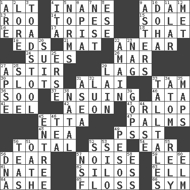 ACROSS 1. The first octave above the treble staff 4. Silly 9. First man 13. Friend of Pooh 14. Drinks excessively 15. Flatfish 16. Epoch 17. Ascend 18. Not this but _ 19. Begley and Asner 21. Floor protector 22. Approach 24. Institutes legal proceedings 26. Make imperfect 27. Moving about 29. Falls behind 30. Graphs 31. Jai _ 33. Scottish cap 36. "Barney Miller" actor Jack 37. Taking place subsequently 40. _ moment's notice (2 wds.) 41. Snakelike fish 42. Age 43. Fourth or lowest deck 45. Singer James 47. Insides of hands 48. Teachers' org. 49. Inconspicuous attention getter 50. "_____ Recall" 52. Compass dir. 54. Hearing organ 56. Letter starter 57. Annoying sound 59. Area sheltered from the wind 61. Nathan's nickname 62. Grain storage towers 63. Pipe bend 64. American tennis player Robert 65. Soft thread for cleaning between teeth 66. Symbol (abbr.) DOWN 1. "We ___ not amused" (Victoria) 2. Old wives' tales, e.g. 3. Inedible or poisonous agaric 4. Call ___ day 5. Typical models 6. Capital of Western Samoa 7. A home for chicks 8. Compass dir. 9. Michaelmas daisies 10. Capital of the state of Qatar 11. Having or resembling wings 12. Was introduced to 20. Set or collection 22. At full speed 23. Tired old horse 25. Celtic language 27. Domed church section 28. A type of plum 29. (Had) reclined 31. At sea 32. Nilotic language 33. Baron Munchausen's specialties 34. Tiny particle 35. Atlas contents 38. Brizilian seaport 39. Republicans 44. Raze (variant) 45. Main course 46. Afternoon social gathering 49. Mexican monetary units 50. Beverages made from leaves 51. Pledge 52. Earth 53. Grain storage tower 55. Trust 56. Heredity factor (abbr.) 57. Science/research agcy. 58. Curvy letter 60. Shade tree