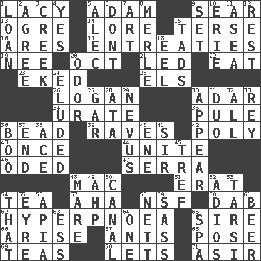 ACROSS 1. Made of lace 5. First of billions? 9. Singe 13. Legendary monster 14. Old wives' tales, e.g. 15. Laconic 16. Ancient Greek god of war 17. Pleas 19. Born 20. Sep. follower 21. Directed 22. Erode 23. Made supply last 25. Raised railways 26. Utah city north of Ogden 30. The sixth month of the Jewish calendar 34. A salt of uric acid 35. Whimper 36. Necklace unit 39. All-night dance parties 42. More than one (prefix) 43. Single time 44. Join together 46. Wrote a lyric poem 47. Spanish missionary in California 48. Apple computer (short form) 51. Part of Q.E.F. 54. Afternoon social gathering 57. Nursemaid (var.) 58. Overdraft (abbr.) 60. Apply (a substance) by light strokes 62. Abnormally rapid or deep breathing 65. Father 66. Ascend 67. Pismires 68. Airs 69. Beverages made from leaves 70. Allows 71. SW Saudi Arabia district DOWN 1. Grant temporary use of 2. Match 3. Small stream 4. It is so 5. Actor Baldwin 6. Do not 7. Nonscientific branch of learning 8. Haggard of country music 9. Arrange properly for use 10. 4th largest of the Great Lakes 11. At sea 12. Relief 15. Small amounts or degrees 18. Snakelike fish 20. Aroma 24. Dodged 27. Slender fish 28. "One Day ___ Time" 29. Congenital growth or mark on the skin 30. Seem 31. Superhero pair 32. Everything 33. Marina Del _, California 36. Surprise greeting 37. Conclude 38. Adept person 40. Compass dir. 41. Title for a knight 45. Not kosher 48. Female horse 49. Electrical Unit 50. Lessep's creation 52. Goodbye (Sp.) 53. Tarsus (plural) 54. Not this but _ 55. Jane of fiction 56. Capital of Western Samoa 58. Remaining after all deductions 59. Backtalk 61. Fermented drink made from hops 63. Curvy letter 64. Single 65. Health resort