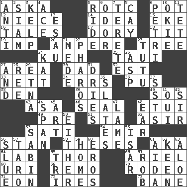 ACROSS 1. "____ silly question..." 5. College mil. group 9. Cooking vessel 12. Sibling's daughter 14. The main thing one is thinking about 15. Supplement with great effort 16. Falsehoods 17. Small, narrow, flatbottom fishing boat 18. Teat (slang) 19. Naughty child 20. Electrical Unit 23. Woody plant 24. Malaysian steamed pastry 25. "Change" in Tahitian 27. Length times width 30. June honoree 32. Eastern Standard Time (abbr.) 33. Remaining after all deductions 34. Blunders 36. Suppuration 38. Lair 39. Petroleum 40. Distress signal 43. White ___ sheet 46. Lick closed 48. Needle holder 49. Before (prefix) 51. R.R. building 52. SW Saudi Arabia district 53. Suttee (variant) 54. Arab leader 56. Comedian Laurel of Laurel & Hardy 58. College papers 61. Alias (abbr.) 64. Experiment locale 65. Son of Odin 66. Satellite of Uranus 68. RI univ. 69. San ____ (Riviera town) 70. Cowboy competition 71. Age 72. Angers 73. Object of repulsion DOWN 1. Opposed to 2. Thailand, formerly 3. Seaweed 4. Adept person 5. Travel on an animal 6. Scent 7. Cigar-shaped 8. Island 9. _ dish (used to culture cells) 10. Migrant worker of the '30s 11. False hair 13. Son of Isaac 21. Ancient Persian 22. N Egypt peninsula 23. Ballerina skirt 24. Krazy ___ of comics 26. Viper 27. Added to 28. To riddle 29. Inactive volcano in Sicily 31. Frees from moisture 35. Chalkboards 37. Fast planes 41. Fr. "Yes" 42. Title for a knight 44. Connect, as a bridge 45. Tate display 47. Unable to walk 48. Ewer handle 50. One or the other 53. Unit of acoustic absorption 55. Austrian river, tributary to the Danube 56. Change direction abruptly 57. Pacific island yam 59. Residence 60. Greek god of love 61. Opera by Verdi 62. Peachy ____! 63. _ vera 65. Three (prefix) 67. Director Reiner