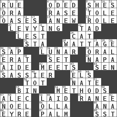 ACROSS 1. Regret 4. Wrote a lyric poem 8. "______ My Girl" (Turtles hit) 12. Mouth or opening 13. To erase 14. Lacquered or enameled metalware 15. Fertile tracts in a desert 18. Afresh 19. Hero or heavy, e.g. 20. Imposing or collecting, as a tax 22. Small boy 23. For fear that 24. Feline 25. R.R. building 26. Electrical Measurement 30. Plant excrement 33. Type of eclipse 36. Taken by mouth 37. Part of Q.E.F. 39. Arrange properly for use 40. California wine valley 41. Assistant 42. Confronts 44. Elected rep. 45. More impudent 47. Raised railways 50. Small child 51. Nathan's nickname 53. Storage container 54. Modes 57. Actor Baldwin 59. Put down 61. Indian princess (variant) 63. Christmas carol 64. Rounded earthenware pot or jar 65. Santa ___, CA 66. Jane of fiction 67. Inside of hand 68. Fast jet (abbr.) DOWN 1. Friend of Pooh 2. Mountain range 3. Artist's stand 4. NW Algerian seaport 5. Mild oath, euphamism for damn 6. Compass dir. 7. Morning condensation 8. Ski resort town in Vermont 9. Parka part 10. Pipe bend 11. Observe 16. Nights before holidays 17. System (abbr.) 21. Slanted text style (abbr.) 22. Make lace 24. Automobile 26. Electrical Unit 27. Caspian sea tributary 28. Yawn 29. Liveliness 30. Oceans 31. Operatic vocal solo 32. Groovy apts. 34. One who makes use of a thing 35. Born 38. A testis 42. Was introduced to 43. Transmitted 46. Electrically charged atom 48. Cowardly lion portrayer 49. Portico 52. Ferber et al. 53. Fermented drink made from hops 54. Place where flour is made 55. Dutch treat 56. Elected reps. 57. One (Scot) 58. Myrna of the movies 59. Trim (branches) 60. Chicken ___ king 62. Consume