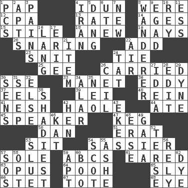 ACROSS 1. Infant food 4. Goddess of spring and wife of Bragi 8. Past tense of be (plural) 12. Accounting whiz (abbr.) 13. Pace 14. Eras 15. Vertical member of a panel or frame 18. Afresh 19. Negative votes 20. Catching in a trap 22. Find the sum of 23. In a ____ (agitated or irritated) 24. Neckwear 25. Unit of force equal to gravity 26. Borne 30. Compass dir. 33. French painter Edouard 36. Whirlpool 37. Snakelike fish 39. Flowery wreath 40. It's straight from the horse's mouth 41. Tender 42. White Person, in Hawaii 44. Had dinner 45. Orator 47. Cask 50. Daniel's nick name 51. Part of Q.E.F. 53. Be seated 54. More lively and spirited 57. Not divided or shared with others 59. Lettered men learn these first 61. Having ears or earlike features 63. Musical composition 64. "Silly old bear" 65. Roguish 66. Proofreading order 67. Carryall 68. Sight organ DOWN 1. Personal Computers (abbr.) 2. Flats, for short 3. Aches 4. SW Asia republic 5. Mild oath, euphamism for damn 6. Shoshoni 7. ___ Haven, CT 8. Nomad 9. Mild oath 10. Marina Del _, California 11. Curvy letter 16. Long (Scottish) 17. One of the Great Lakes 21. Detail 22. Wind 24. Make lace 26. To provide with a ceiling 27. The content of cognition 28. Prepare for publication 29. Unit of force 30. Elected reps. 31. Ooze 32. Otherwise 34. Having or resembling wings 35. Modern: prefix 38. Most questionable 42. Layer 43. Supplements with great effort 46. Krazy ___ of comics 48. Celtic language 49. Greek goddess of the earth (variant) 52. Laconic 53. Change direction abruptly 54. Native of Scotland 55. American tennis player Robert 56. Trust 57. Mayday 58. Elect 59. Fitting 60. Surprise greeting 62. Color