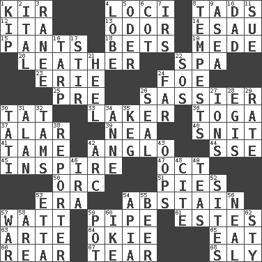 ACROSS 1. Apertif with cassis 4. Locales 8. Bits 12. Call ___ day 13. Aroma 14. He sold his birthright 15. Leg coverings 18. Wagers 19. Ancient Persian 20. Cordwainer's material 22. Health resort 23. 4th largest of the Great Lakes 24. Enemy 25. Before (prefix) 26. More disrespectful 30. Make lace 33. Member of a famous L.A. basketball team 36. Ancient Roman robe 37. Having or resembling wings 39. Teachers' org. 40. In a ____ (agitated or irritated) 41. Docile 42. White American of non-Hispanic descent 44. Compass dir. 45. Motivate 47. Sep. follower 50. The grampus (Milton) 51. Sliced desserts 53. Period 54. Refrain by choice 57. Electrical Unit 59. Corncob 61. _____ Park, CO 63. Johnson of "Laugh-In" 64. Migrant worker of the '30s 65. Consume 66. Posterior 67. Rend 68. Insidious DOWN 1. Sleep 2. Slanted text style (abbr.) 3. Indian princess (variant) 4. Ear part 5. River in Europe 6. Small bed 7. Big collection agency 8. Storms 9. Toward the sea 10. June honoree 11. Take to court 16. Canvas cover 17. Disorderly outburst 21. The bottom of a shoe or boot 22. Mayday 24. Distant 26. Lick closed 27. Charged atoms 28. The front part of a cuirass 29. Assign a rank or rating to 30. Jacques of French films 31. Actor Alda or Thicke 32. Scottish caps 34. Singer Murray 35. Cask 38. Newsperson 42. Curve 43. I made a mistake 46. Retirement account (abbr.) 48. Quote 49. Afternoon social gatherings 52. Locates 53. Singer James 54. Capital of Western Samoa 55. Fermented drink made from hops 56. Actress Patricia 57. Armed conflict 58. "We ___ not amused" (Victoria) 59. Plant holder 60. Mamie's mate 62. Filthy place