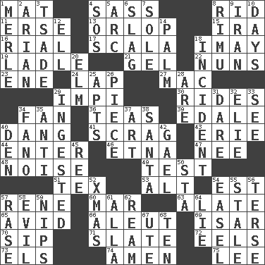 ACROSS 1. Floor covering 4. Backtalk 8. To free from 11. Celtic language 13. Lowest deck of a ship 15. Lyricist Gershwin 16. Monetary unit of Yemen 17. Any of the three canals of the cochlea 18. "If ____ say so..." 19. Dipping utensil 21. Set 22. Religious women 23. Compass dir. 24. Infant locale 27. Apple computer (short form) 29. Body of Kaffir warriors 30. Amusement-park features 34. Avid follower 36. Beverages made from leaves 39. Peak District village in England 40. Mild oath, euphamism for damn 41. Lean end of the neck 43. One of the Great Lakes 44. Keyboard key 46. Inactive volcano in Sicily 47. Born 48. Annoying sound 49. Trial 51. John Ritter's dad 53. Keyboard modifier key 54. Eastern Standard Time (abbr.) 57. French philosopher Descartes 60. Third mo. 63. Having winglike extensions 65. Enthusiastic 66. Native American of Southwest Alaska 69. Austrian river, tributary to the Danube 70. Small drink 71. Chalkboard 72. Snakelike fish 73. Raised railways 74. So be it 75. Area sheltered from the wind DOWN 1. Haggard of country music 2. Believer in; advocate of (suffix) 3. Sadhe (variant) 4. Mayday 5. Curve 6. Volcanic refuse 7. Not divided or shared with others 8. Tall New Zealand timber tree 9. SW Asia republic 10. 24-hour periods 12. Pipe bend 14. Inside of hand 18. Event 20. Shade tree 25. Tenement units (abbr.) 26. Part 28. "We ___ not amused" (Victoria) 29. Consumed 31. Have the gumption 32. Writer Wiesel 33. Observe 34. Papal veil 35. Against 37. Nonscientific branch of learning 38. Before Barbara or Clara 40. Lair 42. Highlander 45. To separate or throw off 50. R.R. building 52. Dec. holiday 54. Artist's stand 55. Showing deterioration from age 56. Laconic 57. Raze (variant) 58. Morally bad or wrong 59. Pinches, bites 61. Silent film actress Nazimova 62. 480, 500 or 516 sheets of paper 64. Falsehood 67. Shoshoni 68. Nine, plus one