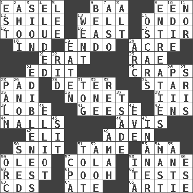 ACROSS 1. Artist's stand 6. Sound made by sheep 9. Car or cant ending 12. Grin 13. Water source 14. Southwest Nigerian state 15. Woman's close-fitting hat 16. 90 degrees 17. Agitate 18. Indiana (abbr.) 19. Inside; within (prefix) 20. 43,560 square feet 21. Part of Q.E.F. 23. Actress Charlotte 24. Prepare for publication 25. Dice game 28. Writing tablet 30. Prevent from occurring 34. Play the lead 35. Black tropical American cuckoo 36. Music written for nine 38. One more than two 39. Ear part 41. Honkers 43. Followers of ems 44. Promenades 46. Deliberation 48. Connecticut Ivy Leaguer 49. An important port of Yemen 50. In a ____ (agitated or irritated) 51. Not wild 53. Wet nurse (var.) 56. Margarine 57. Root beer relative 58. Silly 60. Relief 61. "Silly old bear" 62. Trials 63. Music discs 64. Had dinner 65. Nick name for Arthur DOWN 1. Eastern Standard Time (abbr.) 2. Mine, in Marseilles 3. The Jewish people; Israel 4. Evaded 5. Area sheltered from the wind 6. Necklace unit 7. In addition 8. The first octave above the treble staff 9. Pleas 10. Singer Brickell 11. And not 13. Left 14. Motion picture awards 19. Consumed 20. Curve 22. To free from 24. The property of being fit to eat 26. Ache 27. Indian titles of respect 28. Inside of hand 29. Small Philippine buffalo 31. Coat; cloak 32. Compass dir. 33. Portuguese money of account (variant) 37. Sadhe (variant) 40. American author Paul (1891-1958) 42. Night before a holiday 45. Be seated 47. More lacking in sense or substance 49. Housemaid 50. Downhill vehicle 51. A blast of a horn 52. Medicinal plant 54. Vertical spar for supporting sails 55. Against 56. The grampus (Milton) 57. Accounting whiz (abbr.) 58. Call ___ day 59. Compass dir.