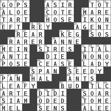 ACROSS 1. Republicans 5. SW Saudi Arabia district 9. Small child 12. Medicinal plant 13. ____ d'Azur (French Riviera) 14. Female horse 15. Small pie 16. Flexible conduit 17. Image 18. Bank Draft (abbr.) 19. Marina Del _, California 21. Rep 22. Stern 24. Barrel 26. Distress signal 27. More uncommon 28. Singer Murray 29. Count _ (2 wds.) 30. Titles for men of rank and authority 32. Slanted text style (abbr.) 36. Opposed to 37. Expire 38. Words to Nanette 39. Airs 40. Desist 42. Kenny Rogers chart-topper in '80 43. Connect, as a bridge 44. Full of seeds 46. Baking dish 49. Actor Linden 50. Pismires 51. Like summer trees 53. Partially opened flower 54. Affectionate concern, for short 57. Johnson of "Laugh-In" 58. "You Light Up My Life" star Conn 61. Fly high 62. Thailand, formerly 63. Wrote a lyric poem 64. Heavy book 65. Cartoonist voice _ Blanc 66. Elected reps. 67. Toward shelter DOWN 1. Yard entry 2. Norwegian king 3. Likenesses of persons 4. Arrange properly for use 5. Painful 6. "Barney Miller" actor Jack 7. ___ a Wonderful Life 8. Portuguese money of account (variant) 9. Receives possession of 10. U. of Maine site 11. Portable shelters 14. Russian fighter aircraft 19. Actress Charlotte 20. Blunders 21. Personal question 23. Bert's buddy 24. Leg joints 25. Followers of ems 27. Western Nevada city 28. Believer in; advocate of (suffix) 29. Atlas unit 31. Perfect 32. An arm off of a larger body of water 33. Inedible or poisonous agaric 34. Actor Griffith 35. Myrna of the movies 40. Numbers guy (abbr.) 41. He sold his birthright 43. Like a shrinking violet 45. Conclude 46. Suffix with ecto or cyto 47. Nest on high 48. Brizilian seaport 52. Opposite of masc. 53. Auction offers 55. Unable to walk 56. Algonquian 58. Two (Sp.) 59. Binary compound 60. Lair 61. R.R. building