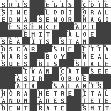 ACROSS 1. Indian titles of respect 5. The front part of a cuirass 9. ____ d'Azur (French Riviera) 13. Trig term 14. Farming town in central California 15. Of the mouth 16. Pulitzer Prize-winning author Ferber 17. Sir (Sp.) 18. Wise men 19. Center 21. Fitting 22. Send forth 23. _ vera 24. Ocean 27. It is 28. Comedian Laurel of Laurel & Hardy 29. Motion picture award 31. A female animal or person 32. Singer James 36. Armed conflicts 37. Male child 38. Be tempered by heat 39. Takes to court 40. Twice 41. Showing deterioration from age 42. "Terrible" tsar 44. Feline 46. Perceive with the eye 47. SW Saudi Arabia district 48. Mitch Miller's instrument 50. "One Day ___ Time" 51. Deli grouping 54. Israeli folk dance 56. Distance measurement (Brit.) 58. Slanted text style (abbr.) 60. Soon (poet.) 61. Ancient Greek god of war 62. Wig 63. Gouge 64. Assign a rank or rating to 65. Stricken, poetically DOWN 1. Compass dir. 2. Travel on an animal 3. Lodging establishments 4. Gospel singer Marvin 5. Opts 6. Went 7. Wedding promise 8. Title for a knight 9. Part 10. Declaim 11. Label 12. Connecticut Ivy Leaguer 17. In a ____ (agitated or irritated) 20. Independent ruler or chieftain 21. Insect wing 23. Had dinner 24. Sty mamas 25. He sold his birthright 26. 1/640 square mile 28. Like a shrinking violet 30. Helper 31. Distress signal 33. Beverages made from leaves 34. Story 35. Toward shelter 37. Storage container 40. Oblong piece of solid material 41. Portico 43. By way of 44. Unrefined 45. Competent 47. Composer Copland 49. Gives off 51. Proofreading order 52. A distinct part 53. Suttee (variant) 54. Possessed 55. Single 56. Make imperfect 57. Period 59. Allow