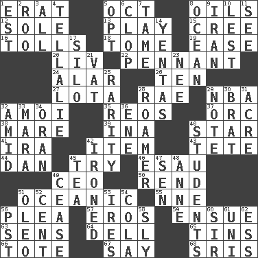 ACROSS 1. Part of Q.E.F. 5. Sep. follower 8. Petroleums 12. Not divided or shared with others 13. Shaw product 15. Algonquian 16. For Whom the Bell _____ 18. Heavy book 19. Comfort 20. 54 in ancient Rome 22. Pre-World Series prize 24. Having or resembling wings 26. "___ Little Indians" 27. Globular water bottle used in Asia 28. Actress Charlotte 29. Basketball assoc. 32. Mine, in Marseilles 35. Vintage cars 37. The grampus (Milton) 38. Female horse 39. _ tizzy (2 wds.) 40. Play the lead 41. Retirement account (abbr.) 42. Detail 43. Wig 44. Daniel's nick name 45. Attempt to accomplish something 46. Son of Isaac 49. Corporate head (abbr.) 50. Tear apart 51. Pertaining to the sea 55. Compass dir. 56. Entreaty 57. Greek god of love 59. Take place subsequently 63. Elected reps. 64. Small valley 65. Canisters 66. Haul 67. Declare 68. Indian titles of respect DOWN 1. Eastern Standard Time (abbr.) 2. Friend of Pooh 3. 100% 4. Copy Pinocchio 5. Elect 6. Hoof sound 7. Docile 8. Sea 9. SW Asia republic 10. For fear that 11. Observe 14. Gossips 17. Grain storage tower 21. Large container 23. Born 25. Noteworthy scarcity 28. Wanderer 29. Musical sound 30. Naughty child 31. Land measure 32. Among 33. Hindu Mythology: god of death 34. NW Algerian seaport 36. Compass dir. 40. SAT takers 42. Pressed 45. Afternoon social gathering 47. Elected rep. 48. Queen of England 1702-14 49. Stop 51. Butter sub 52. Penny 53. Angers 54. Root beer relative 56. Pacific Standard Time (abbr.) 58. Cunning 60. Title for a knight 61. Single; one (prefix) 62. Curvy letter