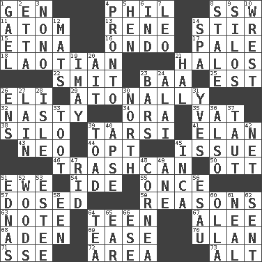 ACROSS 1. Commissioned military rank (abbr.) 4. Silvers or Donahue 8. Compass dir. 11. Smallest unit of an element 13. French philosopher Descartes 14. Move through with a circular motion 15. Inactive volcano in Sicily 16. Southwest Nigerian state 17. Light colored 18. Of or relating to Laos or its people 21. Auras 22. Stricken, poetically 23. Sound made by sheep 25. Eastern Standard Time (abbr.) 26. Biblical high priest 29. Lacking a tonal center or key 32. Characterized by obscenity 34. Mouth or opening 35. Large container 38. Grain storage tower 39. Tarsus (plural) 41. Style 43. Modern: prefix 44. Elect 45. Come out of 46. File 13 50. Baseball player Mel 51. She-sheep 54. Binary compound 55. At one time in the past 57. Administered medicine 59. Thinks logically 63. Observe 64. Adolescent 67. Toward shelter 68. Arabian gulf 69. Relaxation 70. Uhlan (variant) 71. Compass dir. 72. Type of rug 73. Keyboard modifier key DOWN 1. Highlander 2. Singer James 3. Words to Nanette 4. Right away 5. Layer 6. Working for oneself (abbr.) 7. Lion 8. Lacking originality or spontaneity 9. Grain storage towers 10. Take or capture by force 12. Floor coverings 14. Health resort 19. "If ____ say so..." 20. Small island 21. Actor Linden 23. Taverns 24. Jai _ 26. Followers of ems 27. (Had) reclined 28. Small island 30. Compass direction 31. Jacques Cousteau's middle name 33. A blast of a horn 36. In addition 37. Tense 39. Frog relative 40. Domed church section 42. Fish or hair follower 45. South American Indian 47. To free from 48. Pupil covering 49. A saturated hydrocarbon 51. Ferber et al. 52. Forest 53. First name in cosmetics 56. Son of Isaac 58. Car or cant ending 60. Water jar 61. Be tempered by heat 62. Emitted 64. Afternoon social gathering 65. Hearing organ 66. Compass dir.