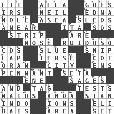 ACROSS 1. Cards in a Roman deck? 4. Silent film actress Nazimova 8. Travels 12. Big collection agency 13. Famous astronaut Armstrong 14. Pulitzer Prize-winning author Ferber 15. Undercover agent 17. At sea 18. Bobsleighs 19. Approach 21. Call ___ day 23. Distress signal 24. Long narrow piece of something 26. "We ___ not amused" (Victoria) 28. Characteristic smell of wine 30. Noisy, rowdy, vocal (Spanish) 34. Music discs 37. Turn sharply 39. Clip 40. Infant locale 41. Laconic 43. Small bed 44. Northwest Algerian city 46. Municipality 47. Followers of ems 48. Pre-World Series prize 51. Bristle 54. Compass dir. 55. Gurus 58. Added to 61. Label 63. Trials 65. Women servants 67. Small Philippine buffalo 71. Comedian Laurel of Laurel & Hardy 72. Southeast Asian peninsula 73. Charged particles 74. Biblical high priest 75. Raised platform 76. Type of rug 77. Put into a specified state DOWN 1. Pale green bean 2. Removes the wrinkles 3. Small island 4. Santa ___, CA 5. French article 6. Whopper 7. Jai _ 8. Set 9. Lyric poems 10. Inside; within (prefix) 11. Backtalk 16. Merit 18. Indian skirt 20. River (Sp.) 22. The 19th letter of the Greek alphabet 25. Inconspicuous attention getter 27. Begley and Asner 29. Opt 30. Musical pauses 31. Single time 32. The Jewish people; Israel 33. Elects 34. Hoof sound 35. Have the gumption 36. Connect, as a bridge 38. RI univ. 42. Snake ____ (dice throw) 45. Compass dir. 49. Pismires 50. Teachers' org. 52. Make lace 53. Eons 56. _____ Park, CO 57. Having lost freshness 58. Among 59. Grandmother 60. "You Light Up My Life" star Conn 62. Greek goddess of the earth (variant) 64. In a ____ (agitated or irritated) 66. Two (Sp.) 68. And not 69. Single 70. White ___ sheet