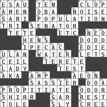 ACROSS 1. He sold his birthright 5. "___ Little Indians" 8. Hoof sound 12. So be it 13. Chief or king in Benin or Nigeria 14. Annoying sound 15. Indian skirt 16. Census information 19. Three (prefix) 20. Legislator 21. False hair 23. And so on (abbr.) 24. Modern: prefix 27. Coop moms 30. Texas town _ City 31. Medicinal drug used to evoke vomiting 34. Singer Brickell 35. ____ Bator, Mongolia 38. Wetness 40. Allows 41. To provide with a ceiling 42. Cigar-shaped 44. Kenny Rogers chart-topper in '80 45. Trial 46. Alias (abbr.) 47. Electrical Unit 50. A really long time 53. More lively and spirited 57. ___ good deed 59. Appease 63. Aroma 64. Bake eggs in their shells 65. Slender fish 66. Repose 67. Lacquered or enameled metalware 68. Playfully artful 69. Algonquian DOWN 1. 90 degrees 2. Don Adams' spy role 3. Nest on high 4. Corn or form start 5. Drink excessively 6. Inky black, to poets 7. California wine valley 8. Small bed 9. Cards in a Roman deck? 10. Bear (Spanish) 11. Fenced enclosure 14. Drug cop 17. Shoshoni 18. Car dealer's back yard 20. Ooze 22. Without force or sincere effort 24. Thickened enlargement 25. Prepare for publication 26. Lyric poems 28. ___ Haven, CT 29. Scram! 30. Erase 32. Had dinner 33. Foregone conclusion 35. Southern CA. univ. 36. Path through which fluid escapes 37. Opera by Verdi 39. Portuguese money of account (variant) 43. Russian ruler of old 47. SW Saudi Arabia district 48. Floor protector 49. 23rd letter of the Greek alphabet 51. More peculiar 52. Trap for birds or small mammals 54. Droops 55. Slanted text style (abbr.) 56. Suggestive of the supernatural 58. Johnson of "Laugh-In" 59. Pacific Standard Time (abbr.) 60. 17th letter of the Greek alphabet 61. Petroleum 62. Before (prefix) 63. The grampus (Milton)
