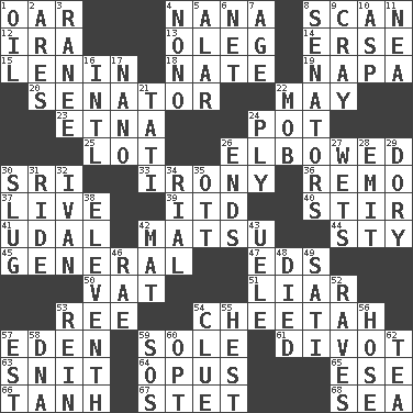 ACROSS 1. Boat paddle 4. Grandmother 8. Examine hastily 12. Retirement account (abbr.) 13. Cassini of fashion 14. Celtic language 15. Soviet premier 1918-24 18. Nathan's nickname 19. California wine valley 20. Elected representative 22. Can I? 23. Inactive volcano in Sicily 24. Cooking vessel 25. Car dealer's back yard 26. Turned at an angle; bent 30. Indian title of respect (Mr.) 33. Literary sarcasm 36. San ____ (Riviera town) 37. Not recorded 39. It would 40. Disorderly outburst 41. Hereditary estate 42. Taiwanese island in East China Sea 44. Filthy place 45. Commissioned military rank 47. Begley and Asner 50. Large container 51. One who doesn't tell the truth 53. To separate or throw off 54. Leopard's kin 57. Paradise 59. Not divided or shared with others 61. A piece of turf (Scot.) 63. In a ____ (agitated or irritated) 64. Musical composition 65. Compass dir. 66. Hyperbolic tangent 67. Proofreading order 68. Ocean DOWN 1. Lubricate 2. Ancient Greek god of war 3. The wife of a rajah (variant) 4. Words to Nanette 5. Having or resembling wings 6. Fish or hair follower 7. Grow older 8. Elected representatives 9. Supercomputer manufacturer 10. Cleo's killer 11. Teachers' org. 16. International (abbr.) 17. Billionth: prefix 21. Jacques of French films 22. Disorderly crowd 24. Strand of rope, yarn or thread 26. Extremities 27. Soaks 28. Give off 29. Rowboat 30. A hard, heavy blow 31. Travel on an animal 32. _ the terrible 34. Monetary unit of Yemen 35. Baseball player Mel 38. Veterans Day date 42. Floor covering 43. Ubangi River tributary 46. Actress Charlotte 48. Passed on 49. Suttee (variant) 52. All-night dance parties 53. It's straight from the horse's mouth 54. A slight indication 55. Behest 56. Flexible conduit 57. Eastern Standard Time (abbr.) 58. Heredity factor (abbr.) 59. Mayday 60. Elect 62. Beverage made from leaves