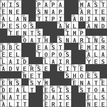ACROSS 1. Part of HMS, perhaps 4. Dad 8. Vertical spar for supporting sails 12. Compass dir. 13. Fastener 14. Johnson of "Laugh-In" 15. Actor Alda or Thicke 17. Native american tent (variation) 18. Believer in; advocate of (suffix) 19. Mexican monetary units 21. Leather borer 23. Also 24. Portable shelters 26. Naughty child 28. Pledge 30. Catching in a trap 34. English channel? 37. Compass direction 39. Independent ruler or chieftain 40. Snakelike fish 41. Traditional theme or motif 43. Wing 44. Put down 46. Den 47. Affirmative reply 48. Contrary to your interests or welfare 51. Quote 54. Fish or hair follower 55. Imelda's hoard 58. Followers of ems 61. Symbol (abbr.) 63. Related on the mother's side 65. Started a card game 67. The front part of a cuirass 71. Portico 72. Nathan's nickname 73. Raised platform 74. Raised railways 75. Came down and settled, as after flight 76. 4th largest of the Great Lakes 77. Born DOWN 1. Pile 2. An arm off of a larger body of water 3. Gospel singer Marvin 4. Pacific Standard Time (abbr.) 5. Cuckoo 6. Infant food 7. Capital of Western Samoa 8. Spoil 9. Operatic vocal solo 10. Comedian Laurel of Laurel & Hardy 11. Be inclined (to) 16. Words to Nanette 18. _ mater 20. R.R. building 22. Acquire through effort 25. Proofreading order 27. Before (prefix) 29. White Person, in Hawaii 30. Unemotional 31. "If ____ say so..." 32. The longest river in the world 33. Pate de foie ____ 34. Actor Lugosi 35. Necklace unit 36. 154 in Roman numerals 38. Health resort 42. Indian titles of respect 45. Lair 49. State of inaction 50. Filthy place 52. Definite Article 53. Immeasurably long periods of time 56. Eroded 57. Fur scarf 58. Pulitzer Prize-winning author Ferber 59. Actress Patricia 60. Suttee (variant) 62. Ancient Persian 64. Comfort 66. Allow 68. Slender fish 69. One more than two 70. Compass dir.