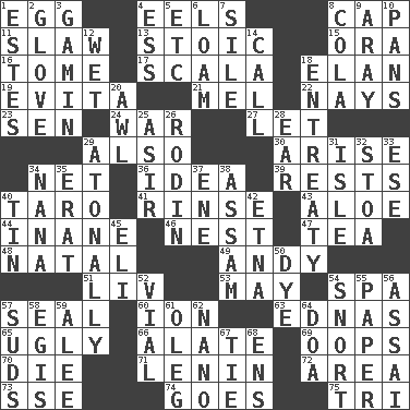 ACROSS 1. Ovum 4. Snakelike fish 8. Head covering 11. Cole _ (cabbage dish) 13. Unemotional 15. Mouth or opening 16. Heavy book 17. Any of the three canals of the cochlea 18. Flair 19. Webber/Rice musical 21. Cartoonist voice _ Blanc 22. Negative votes 23. Elected rep. 24. Armed conflict 27. Allow 29. In addition 30. Originate 34. Fish or hair follower 36. The main thing one is thinking about 39. Musical pauses 40. Pacific island yam 41. Remove soap 43. Medicinal plant 44. Lacking in sense or substance 46. A home for chicks 47. Afternoon social gathering 48. Brizilian seaport 49. Actor Griffith 51. 54 in ancient Rome 53. Fifth month 54. Health resort 57. Lick closed 60. Electrically charged atom 63. Ferber et al. 65. Repulsive 66. Having winglike extensions 69. I made a mistake 70. Pass on 71. Soviet premier 1918-24 72. Type of rug 73. Compass dir. 74. Leaves 75. Three (prefix) DOWN 1. _____ Park, CO 2. Michael Jackson trademark 3. Street urchin 4. Double-curved letter 5. And so on (abbr.) 6. Rich soil 7. Drop; flow; fall 8. Root beer relative 9. Like ___ of sunshine 10. Baking dishes 12. Soggy 14. Give a ring to 18. Plea 20. Leather borer 25. SW Saudi Arabia district 26. "The Thinker" sculptor 28. Hearing organ 29. Without tonality 31. Capri or Wright 32. Portico 33. Compass dir. 34. Nanny 35. Part of Q.E.F. 37. Compass dir. 38. Indian state 40. Metal container 42. Inactive volcano in Sicily 45. Connecticut Ivy Leaguer 50. Color 52. Small bottle 54. Derisive sound 55. Some stationery 56. Slender Brazilian palm 57. Soap bubbles 58. The front part of a cuirass 59. Toward shelter 61. Cassini of fashion 62. Billionth: prefix 64. ___ good deed 67. Make a knot 68. Followers of ems