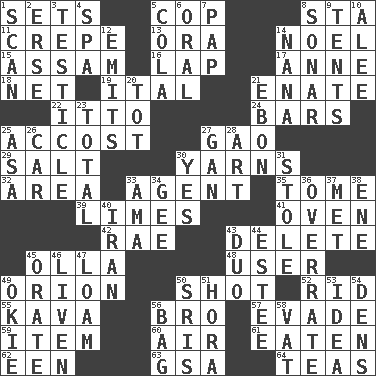 ACROSS 1. Puts into a specified state 5. Police officer (slang) 8. R.R. building 11. Streamer paper 13. Mouth or opening 14. Christmas carol 15. Indian state 16. Infant locale 17. Queen of England 1702-14 18. Fish or hair follower 19. Slanted text style (abbr.) 21. Related on the mother's side 22. "Tell ____ the Marines!" 24. Drinking establishments 25. Buttonhole 27. E Mali city 29. Table seasoning 30. Tall tales 32. Type of rug 33. Rep 35. Heavy book 39. Citrus fruits 41. Baking chamber 42. Actress Charlotte 43. Keyboard key 45. Rounded earthenware pot or jar 48. One who uses or employs something 49. Greek mythologigal hunter 50. Opportunity 52. To free from 55. Polynesian shrub of the pepper family 56. Sis' sibling 57. Dodge 59. A whole individual unit 60. Wind 61. Ingested 62. Car or cant ending 63. Girls' org. (abbr.) 64. Beverages made from leaves DOWN 1. Examine minutely or intensely 2. Celtic language 3. One of the two male reproductive glands 4. Health resort 5. Root beer relative 6. Spoken 7. Infant food 8. Echolocation 9. Portable shelters 10. Toward shelter 12. Sends forth 14. Grandmother 20. Small child 21. Inky black, to poets 23. "_____ Recall" 25. White ___ sheet 26. Auto 27. Separate the seeds from cotton 28. Tate display 30. It is so 31. Took without asking 33. Housemaid (var.) 34. Turn to the right 36. Make much ado about nothing 37. Was introduced to 38. Compass dir. 40. SW Asia republic 43. Superhero pair 44. First name in cosmetics 45. Speak pompously 46. Make or become more lively 47. Rich soil 49. Migrant worker of the '30s 50. Indian titles of respect 51. Israeli folk dance 53. The content of cognition 54. Hiding places for outlaws 56. Container for groceries 58. Large container