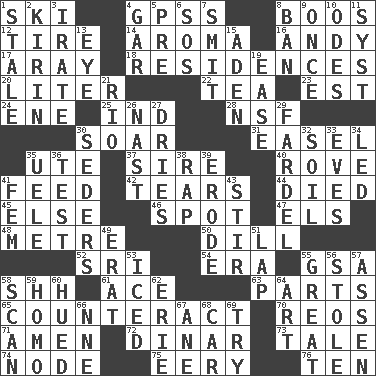 ACROSS 1. What Jean-Claude Killy likes to do 4. Global Positioning Systems (abbr.) 8. Scornful sounds 12. Become fatigued 14. Scent 16. Actor Griffith 17. Like ___ of sunshine 18. Homes 20. 61 cubic inches 22. Afternoon social gathering 23. Eastern Standard Time (abbr.) 24. Compass dir. 25. Indiana (abbr.) 28. Science/research agcy. 30. Fly high 31. Artist's stand 35. Shoshoni 37. Beget 40. Be footloose 41. Nourish 42. Pulls into pieces 44. Passed on 45. Otherwise 46. Blemish 47. Raised railways 48. Distance measurement (Brit.) 50. Deli pickle 52. Indian title of respect (Mr.) 54. Period 55. Girls' org. (abbr.) 58. Quiet! 61. Adept person 63. Pieces 65. Act in opposition 70. Vintage cars 71. So be it 72. Middle Eastern gold or silver currency 73. Story 74. Connecting point 75. Suggestive of the supernatural 76. "___ Little Indians" DOWN 1. Having lost freshness 2. Japanese brewing company 3. Feeling or showing extreme anger 4. Slender fish 5. Before (prefix) 6. Distress signal 7. Stricken, poetically 8. Bar 9. Single time 10. Lyric poems 11. System (abbr.) 13. Sight organ 15. Arabian gulf 19. Relaxation 21. _ de Janeiro 26. Political cartoonist Thomas 27. Frees from moisture 29. Bundle 30. Spring feasts 32. The visible part of the earth's surface 33. Nights before holidays 34. Directed 35. Ubangi River tributary 36. Trial 38. Reproach for some lapse or misdeed 39. Eat (away) 41. Opposite of masc. 43. Commotion 49. Part of Q.E.F. 51. Infant locale 53. On the rocks 55. Relatively large 56. Took without asking 57. NE Netherlands city 58. Examine minutely or intensely 59. Same (prefix) 60. Became colored 62. 4th largest of the Great Lakes 64. Tate display 66. Compass dir. 67. A saturated hydrocarbon 68. 4-wheeled motor vehicle 69. Attempt