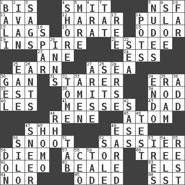 ACROSS 1. Twice 4. Stricken, poetically 8. Overdraft (abbr.) 11. Actress Gardner 12. Ethiopian city, capital of Harari 14. Monetary unit of Botswana 15. Fails to keep up a pace 17. Declaim 18. Aroma 19. Heighten or intensify 21. First name in cosmetics 23. A saturated hydrocarbon 24. Curvy letter 25. Merit 27. At sea 30. Separate the seeds from cotton 31. A viewer who gazes fixedly 34. Period 37. Eastern Standard Time (abbr.) 38. Leaves out 39. Lower and raise head in agreement 40. French article 41. Makes clutter 43. Male parent 44. French philosopher Descartes 45. Smallest unit of an element 47. Quiet! 49. Compass dir. 50. Snout, nose 52. More disrespectful 56. South Vietnam president (1954) 57. Thespian 60. Woody plant 61. Margarine 62. Memphis, Tenn. Street 63. Raised railways 64. Not either 65. Wrote a lyric poem 66. Fast jet (abbr.) DOWN 1. Indonesian resort city 2. _ the terrible 3. Droops 4. Dinah or Pauly 5. Female horse 6. Lyricist Gershwin 7. Make lace 8. Unadorned figures 9. A type of plum 10. Distant 13. To sift 14. Cooking vessels 16. Practice fight 20. Lodging establishments 22. Ocean 25. Comfort 26. Pismires 27. Get up 28. Arranges properly for use 29. Celtic language 30. Set 32. Heavy book 33. So be it 34. Inside; within (prefix) 35. Wander 36. Say or write further 42. Backtalk 44. 17th letter of the Greek alphabet 46. Trial 47. Contemptuous expression 48. Same (prefix) 49. Having ears or earlike features 50. Grain storage tower 51. Keyboard key 52. Flatfish 53. Angers 54. Snakelike fish 55. Relief 56. Spanish title 58. Corporate head (abbr.) 59. Small boy