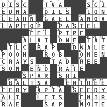ACROSS 1. Compact _ 5. Federal power corp. 8. _-fi 11. Pulitzer Prize-winning author Ferber 12. Lubricates 14. Electrically charged atom 15. Acquire or gain knowledge or skills 17. Highlander 18. Small Philippine buffalo 19. Portable computer 21. Soft color 23. Snakelike fish 25. Corncob 26. Mountain range southwest of Kyrgyzstan 27. Single 28. Make lace 31. Affectionate concern, for short 33. Strike 35. A sleeping potion; an opiate (poet.) 37. "Silly old bear" 38. Director Reiner 40. Presage 41. Trading vessels 43. Small amount or degree 45. Portuguese money of account (variant) 46. Boy, to dad 47. Conclude 50. Pace 52. Coast Guard woman 53. Indian title of respect (Mr.) 54. Greek mezzo-soprano Agnes 56. Main course 61. Suggestive of the supernatural 62. Capital of Western Samoa 65. Sleazy 66. Keyboard modifier key 67. Allows 68. Independent ruler or chieftain 69. Actress Charlotte 70. Plant excrement 71. Make mention of DOWN 1. Small valley 2. The content of cognition 3. Fastener 4. Haul 5. Coat; cloak 6. By way of 7. City in Syria 8. Trig term 9. Calm and collected 10. _ tizzy (2 wds.) 13. Killed 16. Christmas carol 18. Had dinner 20. Lightbulb-shaped fruit 22. Broke a traffic law 24. One who doesn't tell the truth 26. Painful 28. Not wild 29. Toward shelter 30. "___ Little Indians" 31. "Corrida" creature 32. Grant temporary use of 34. Cooking vessel 36. Had on 37. Personal Computers (abbr.) 39. Taverns 42. Back-to-school mo. 44. Have the gumption 48. Rhinal 49. Window treatments 51. Canisters 52. Wily 54. Actor Lugosi 55. Johnson of "Laugh-In" 57. Adolescent 58. San ____ (Riviera town) 59. Prepare for publication 60. Jane of fiction 61. Ewer handle 63. Call ___ day 64. Cleo's killer