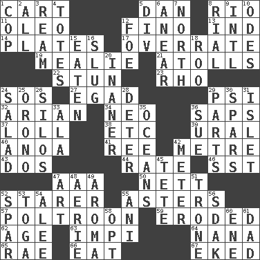 ACROSS 1. Heavy open wagon 5. One of the 12 tribes of Israel 8. _ de Janeiro 11. Butter sub 12. A pale, very dry sherry 13. Indiana (abbr.) 14. Food holders 17. Make much ado about nothing 19. Ear of corn 21. Ringlike coral islands and reefs 22. Make senseless or dizzy 23. 17th letter of the Greek alphabet 24. Mayday 27. Mild oath 29. 23rd letter of the Greek alphabet 32. Believer in; advocate of (suffix) 34. Modern: prefix 36. Plant excrements 37. Hang loosely or laxly 38. And so on (abbr.) 39. Mountain range 40. Small Philippine buffalo 41. Portuguese money of account (variant) 42. Distance measurement (Brit.) 43. Two (Sp.) 44. Assign a rank or rating to 46. Fast jet (abbr.) 47. Auto club (abbr.) 50. Remaining after all deductions 52. A viewer who gazes fixedly 55. Michaelmas daisies 57. Characterized by complete cowardliness 59. Worn away 62. Grow older 63. Body of Kaffir warriors 64. Nanny 65. Actress Charlotte 66. Consume 67. Supplemented with great effort DOWN 1. Police officer (slang) 2. 100% 3. 480, 500 or 516 sheets of paper 4. Hauls 5. HTML Container Element 6. Approach 7. _ pole 8. Monetary unit of Yemen 9. International (abbr.) 10. Lyric poems 12. Enemy 15. Eroded 16. A hard, heavy blow 18. Friend of Pooh 20. Sillier 24. First course 25. U. of Maine site 26. Grain storage towers 28. Prevent from occurring 29. Actors' quests 30. Practice fights 31. Small island 33. Chicken ___ king 35. Seas 36. Take to court 42. Distance measurement 45. Wig 47. Nonscientific branch of learning 48. Nest on high 49. Odor 51. Heavy duty weighing machine 52. Practice fight 53. Ancient Roman robe 54. Toward shelter 55. Black tropical American cuckoo 56. Neighbor of Neb. 58. Elect 60. Compass dir. 61. June honoree