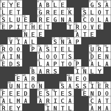 ACROSS 1. Sight organ 4. Competent 8. Girls' org. (abbr.) 11. Allow 12. Of Greece 14. Narrow opening 15. Change direction abruptly 17. Canadian anthropologist Darnell 18. Root beer relative 19. Curse 21. Collection of objects 23. Born 24. Had dinner 25. Small bottle 27. Fastener 30. Friend of Pooh 31. Soft color 34. RI univ. 37. The 18th letter of the Arabic alphabet 38. Plunders 39. Lair 40. Begley and Asner 41. Portable computer 43. In the manner of 44. Drinking establishments 45. Inwardly 47. Ewer handle 49. Modern: prefix 50. The state of being joined or united 52. More lively and spirited 56. Nourish 57. _____ Park, CO 60. Inside; within (prefix) 61. _ mater 62. N. Chile seaport 63. Feline 64. Marina Del _, California 65. International (abbr.) 66. Wet nurse (var.) DOWN 1. Otherwise 2. Sharp bark 3. Needle holder 4. Match 5. Cy Young winner Saberhagen 6. Part of a journey 7. Car or cant ending 8. Michael Jackson trademark 9. Not divided or shared with others 10. _ moment's notice (2 wds.) 13. Krazy ___ of comics 14. Native of Scotland 16. Inactive volcano in Sicily 20. Aid 22. Hit sharply and swiftly 25. Nothingness 26. Charged particles 27. Constricts 28. Remaining after all deductions 29. In addition 30. Actress Charlotte 32. Silent film actress Nazimova 33. Fly high 34. Freehold land 35. Depend 36. _ tizzy (2 wds.) 42. Sliced desserts 44. Sis' sibling 46. Olfactory organ 47. Foe 48. Opera by Verdi 49. Rhinal 50. Ubangi River tributary 51. Teachers' org. 52. Religious group 53. South American Indian 54. Dutch treat 55. Round or rotation of duties 56. Distant 58. Indian title of respect (Mr.) 59. Shallow baking pan