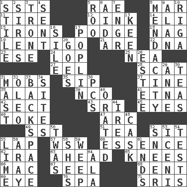 ACROSS 1. Fast planes 5. Actress Charlotte 8. Make imperfect 11. Hoop that covers a wheel 12. Pig sound 14. Biblical high priest 15. Removes the wrinkles 17. Plash 18. Tired old horse 19. Small, flat, pigmented spot on the skin 21. "We ___ not amused" (Victoria) 22. Heredity factor (abbr.) 23. Compass dir. 24. Chop off 25. Teachers' org. 27. Snakelike fish 28. Jazz singing style 31. Disorderly crowds 35. Small drink 37. Prong on a fork 38. Jai ____ 39. Non-commissioned officer (abbr.) 41. Inactive volcano in Sicily 42. Religious group 43. _ Lanka 45. Snake ____ (dice throw) 46. Puff or smoke 47. Curve 49. Fast jet (abbr.) 51. Beverage made from leaves 52. Be seated 55. Infant locale 57. Compass dir. 60. Gist 62. Lyricist Gershwin 63. At or in the front 65. Leg joints 66. Apple computer (short form) 67. Sew up the eyelids of hawks and falcons 68. Incision 69. Sight organ 70. Health resort 71. Indian titles of respect DOWN 1. Vertical member of a panel or frame 2. Fathers 3. Marketplace scale 4. Emitted 5. Friend of Pooh 6. Opera by Verdi 7. Engineer (abbr.) 8. Ananias' fault 9. Actor Alda or Thicke 10. Capital of Latvia 13. Peachy ____! 16. Filth; sediment 17. Cotton for raincoats, e.g. 20. Moves 26. First name in cosmetics 29. Singer Murray 30. Afternoon social gatherings 31. Vertical spar for supporting sails 32. Margarine 33. Keyboard key 34. Settings 36. Personal Computers (abbr.) 40. Declaimed 44. Angers 48. Keg 50. It was, poetically 52. Scornful expression 53. Ancient Celtic tribe of eastern Britain 54. Trials 55. Welles in "The Third Man" 56. Like ___ of sunshine 58. "______ My Girl" (Turtles hit) 59. Shed a tear 61. Conclusions 64. According to