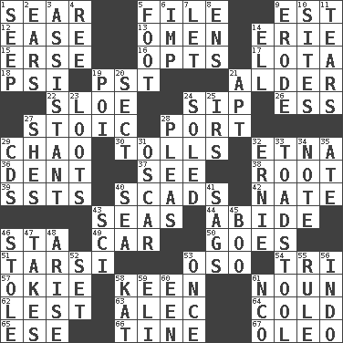 ACROSS 1. Shrivel 5. Do some clerical work 9. Eastern Standard Time (abbr.) 12. Comfort 13. Sign of things to come 14. 4th largest of the Great Lakes 15. Celtic language 16. Chooses 17. Globular water bottle used in Asia 18. 23rd letter of the Greek alphabet 19. Pacific Standard Time (abbr.) 21. Tree or shrub in the Birch family 22. A type of plum 24. Small drink 26. Double-curved letter 27. Unemotional 28. Left side of a ship or aircraft 29. US Secretary of Labor Elaine L. _ 30. For Whom the Bell _____ 32. Inactive volcano in Sicily 36. Gouge 37. Perceive with the eye 38. Carrot, for example 39. Fast planes 40. Large numbers or amounts 42. Nathan's nickname 43. Oceans 44. Stay 46. R.R. building 49. 4-wheeled motor vehicle 50. Leaves 51. Tarsus (plural) 53. Bear (Spanish) 54. Three (prefix) 57. Migrant worker of the '30s 58. Peachy ____! 61. Part of speech 62. For fear that 63. Actor Baldwin 64. Chilled 65. Compass dir. 66. Prong on a fork 67. Butter sub DOWN 1. Ooze 2. Hearing organs 3. Aide 4. To sift 5. One third of a yard 6. Naughty child 7. Allow 8. Followers of ems 9. Eat (away) 10. Locates 11. Pulls apart 14. Pipe bend 19. Luau course 20. Religious group 21. Fitting 23. Plunders 24. Having a sole or soles 25. Big collection agency 27. "______ My Girl" (Turtles hit) 28. Entreaties 29. Music discs 31. Motion picture award 32. Bert's buddy 33. Inedible or poisonous agaric 34. Make mention of 35. Had dinner 40. Ocean 41. Sinks 43. _-fi 45. Sometimes accompanies a hiss 46. Took without asking 47. Proceeds 48. Ascend 52. Put into a specified state 53. Single time 55. Court order 56. _ china 58. Krazy ___ of comics 59. Biblical high priest 60. Car or cant ending 61. Non-commissioned officer (abbr.)