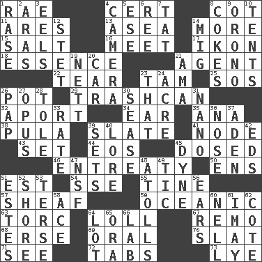 ACROSS 1. Actress Charlotte 4. Foregone conclusion 8. Small bed 11. Ancient Greek god of war 13. At sea 14. Greater amount 15. Table seasoning 16. Rendezvous 17. Image 18. Substance 21. Rep 22. Lacerate 23. Scottish cap 25. Distress signal 26. Plant holder 29. File 13 32. To the left, to Queeg 34. Hearing organ 35. Santa ___, CA 38. Monetary unit of Botswana 39. Schedule 41. Connecting point 43. Arrange properly for use 44. Greek goddess of the dawn 45. Administered medicine 46. Plea 50. Followers of ems 51. Eastern Standard Time (abbr.) 54. Compass dir. 55. Prong on a fork 57. Bundle of cut stalks of grain 59. Pertaining to the sea 63. Torque (variant) 64. Hang loosely or laxly 67. San ____ (Riviera town) 68. Celtic language 69. Of the mouth 70. Narrow board 71. Perceive with the eye 72. Bar bills 73. Sodium hydroxide DOWN 1. To erase 2. Caspian sea tributary 3. Snakelike fish 4. Device for capturing images 5. Compass dir. 6. Portuguese money of account (variant) 7. Make lace 8. Popular sodas 9. U. of Maine site 10. Portable shelters 12. Proofreading order 14. Russian fighter aircraft 19. Remaining after all deductions 20. 4-wheeled motor vehicle 21. Nanny (var.) 23. Not this but _ 24. Land measure 26. Infant food 27. Musical composition 28. Lacquered or enameled metalware 30. Gospel singer Marvin 31. Billionth: prefix 33. Assign a rank or rating to 36. Olfactory organ 37. Arabian gulf 39. Arranges properly for use 40. Old wives' tales, e.g. 42. Begley and Asner 45. Centimeter-gram-second unit of force 47. Overdraft (abbr.) 48. Ringlike coral islands and reefs 49. Nervous spasm 51. _____ Park, CO 52. Dinah or Pauly 53. Laconic 56. Hearing organs 58. Adept person 60. 1994 drama film starring Jodie Foster 61. "If ____ say so..." 62. ____ d'Azur (French Riviera) 64. Car dealer's back yard 65. Mouth or opening 66. Experiment locale