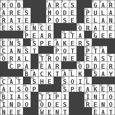 ACROSS 1. Disorderly crowd 4. Curves 8. Slender fish 11. Ancient Greek god of war 13. Method 14. Monetary unit of Botswana 15. Assign a rank or rating to 16. Introduce or present, as a question 17. Style 18. Substance 21. Speak pompously 22. Lightbulb-shaped fruit 23. Call ___ day 25. Unit of force equal to gravity 26. Followers of ems 29. Orators 32. 2nd pers. sing. pres. of can (arch.) 34. Plant holder 35. Parent Teacher Assoc. 38. Of the mouth 39. Heavy duty weighing machine 41. 90 degrees 43. Numbers guy (abbr.) 44. Ewer handle 45. More peculiar 46. Sass 50. Declare 51. Feline 54. A female animal or person 55. Land 57. Columnist Joseph or Stewart 59. Orator 63. Prejudice 64. Native american tent (variation) 67. To the inside or interior of 68. _ china 69. Lyric poems 70. Former U.S. Attorney General Janet 71. Born 72. Left 73. Erode DOWN 1. Female horse 2. Mouths or openings 3. Antes 4. Electrical Unit 5. Friend of Pooh 6. Music discs 7. Perceive with the eye 8. POW camp 9. Having winglike extensions 10. The wife of a rajah (variant) 12. Ooze 14. For each 19. A home for chicks 20. Head covering 21. Rowing implement 23. Picture 24. Wig 26. Environmental prefix 27. Drug cop 28. Fastener 30. To the left, to Queeg 31. Hurried 33. Broad, flat, thick piece 36. Small amounts or degrees 37. Toward the sea 39. Technical work 40. Libertine 42. Attempt 45. Migrant worker of the '30s 47. Viper 48. Aid 49. Chop off 51. Apartment or room in a ship 52. Place in a line 53. Sadhe (variant) 56. Den 58. Bear (Spanish) 60. Leg joint 61. Inactive volcano in Sicily 62. Carrot, for example 64. Pull behind 65. Binary compound 66. Fenced enclosure