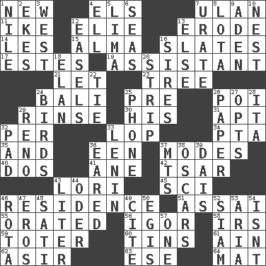 ACROSS 1. ___ Haven, CT 4. Raised railways 7. Uhlan (variant) 11. Mamie's mate 12. Writer Wiesel 13. Wear away 14. French article 15. _ mater 16. Chalkboards 17. _____ Park, CO 19. Helper 21. Allow 23. Relationship diagram 24. Indonesian resort city 25. Before (prefix) 26. Luau course 29. Remove soap 30. Part of HMS, perhaps 31. Fitting 32. For each 33. Trim (branches) 34. Parent Teacher Assoc. 35. Added to 36. Car or cant ending 37. Methods 40. Two (Sp.) 41. One (Scot) 42. Russian ruler of old 43. Australian parrot (variant) 45. _-fi 46. Home 51. Slender Brazilian palm 55. Declaimed 56. Russian composer Stravinsky 58. Big collection agency 59. Carrier 60. Canisters 61. The 18th letter of the Arabic alphabet 62. SW Saudi Arabia district 63. Compass dir. 64. Floor protector DOWN 1. Mediterranean tributary 2. Supplements with great effort 3. Compass direction 4. Pipe bend 5. Pale green bean 6. Oceans 7. A salt of uric acid 8. Globular water bottle used in Asia 9. An important port of Yemen 10. A home for chicks 12. Artist's stands 13. Otherwise 16. Titles for men of rank and authority 18. Style 20. Remove all contents or possession from 22. Make a knot 24. Avian creatures 25. Give a jingle 26. Some stationery 27. Elects 28. Call ___ day 29. Western Nevada city 32. Groovy apt. 33. Soviet premier 1918-24 36. Having ears or earlike features 37. Mountains (abbr.) 38. Motion picture awards 39. Raised platform 43. 61 cubic inches 44. Baltic tributary 46. Round or rotation of duties 47. Greek god of love 48. Suttee (variant) 49. Quote 50. Armor plate that protects the chest 52. Thailand, formerly 53. Operatic vocal solo 54. Is not 57. Single