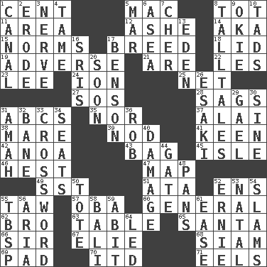 ACROSS 1. Penny 5. Big _ 8. Small child 11. Type of rug 12. American tennis player Robert 14. Alias (abbr.) 15. Typical models 17. A special lineage 18. Hat (slang) 19. Contrary to your interests or welfare 21. "We ___ not amused" (Victoria) 22. French article 23. Area sheltered from the wind 24. Electrically charged atom 25. Fish or hair follower 27. Mayday 28. Droops 31. Lettered men learn these first 35. And not 37. Mountain range southwest of Kyrgyzstan 38. Female horse 39. Dreamland 41. Peachy ____! 42. Small Philippine buffalo 43. Paper or plastic container 45. Capri or Wright 46. Command 47. Atlas unit 49. Fast jet (abbr.) 51. "One Day ___ Time" 52. Followers of ems 55. The 23rd letter of the Hebrew alphabet 57. Chief or king in Benin or Nigeria 60. Commissioned military rank 62. Sis' sibling 63. Eating place 65. Before Barbara or Clara 66. Title for a knight 67. Writer Wiesel 68. Thailand, formerly 69. Writing tablet 70. It would 71. Snakelike fish DOWN 1. Lessep's creation 2. Wear away 3. Impudent aggressiveness 4. Not wild 5. Impair 6. At sea 7. "Mermaids" star 8. Baron Munchausen's specialties 9. Migrant worker of the '30s 10. Bits 13. Genesis locale 16. Indian titles of respect 17. Gillaume's butler role 20. Within a short period 26. 1973 Nobel Price Winner (Physics) Leo 29. Highlander 30. Trig term 31. Housemaid 32. Object of repulsion 33. What you're doing now 34. Theater features 36. Director Reiner 40. Break 44. Yard entry 48. Zero-star reviews 50. Carryall 52. Bert's buddy 53. Relating to or accompanying birth 54. Hits or strikes with great force 55. Cook's measure (abbr.) 56. Operatic vocal solo 58. Indonesian resort city 59. "This won't hurt ____!" 61. Comfort 64. Directed