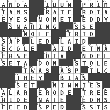 ACROSS 1. Small Philippine buffalo 5. Goddess of spring and wife of Bragi 9. Demure 13. Scottish caps 14. Assign a rank or rating to 15. Round or rotation of duties 16. Sight organs 17. Music written for nine 18. Whirlpool 19. Catching in a trap 21. Compass dir. 22. Undercover agent 23. Musical group of three 24. Plant excrement 27. Directed 28. Put down 29. Learning spot: Fr. 31. Assist 32. Inactive volcano in Sicily 36. Celtic language 37. HTML Container Element 38. Christmas carol 39. Bristle 40. Spanish title 41. Took without asking 42. It was, poetically 44. Cleo's killer 46. Affectionate concern, for short 47. Those people 48. Prejudice 50. Put into a specified state 51. Simpletons 54. Having or resembling wings 56. Wear away 58. Woody plant 60. Travel on an animal 61. Nathan's nickname 62. Immeasurably long periods of time 63. Nourish 64. Hurried 65. Fast planes DOWN 1. Had dinner 2. Negative votes 3. Sign of something about to happen 4. Indian state 5. Pressed 6. Mild oath, euphamism for damn 7. Shoshoni 8. Fish or hair follower 9. Elected leader of a country 10. Cowboy competition 11. It would 12. Can I? 17. Mediterranean tributary 20. Hero or heavy, e.g. 21. Indian title of respect (Mr.) 23. Small boy 24. Perceives with the eye 25. Measure of real estate 26. Mail 28. 54 in ancient Rome 30. Resembling or made to resemble leather 31. The 18th letter of the Arabic alphabet 33. A blast of a horn 34. 1994 drama film starring Jodie Foster 35. Actor Baldwin 37. Two (Sp.) 40. 24 hours 41. Connect, as a bridge 43. Soggy 44. Remained 45. Trig term 47. Sadhe (variant) 49. Settings 51. Make mention of 52. Greek god of love 53. Posted 54. Sandy's bark 55. Untruth 56. Followers of ems 57. Strike 59. Curvy letter
