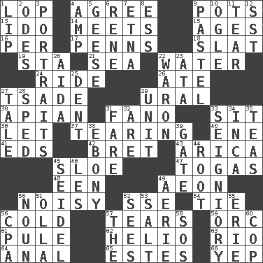 ACROSS 1. Trim (branches) 4. Match 9. Plant holders 13. Wedding promise 14. Confronts 15. Eons 16. For each 17. Actor Sean's family 18. Narrow board 19. R.R. building 21. Ocean 22. Wetness 24. Travel on or in a vehicle 26. Had dinner 27. Sadhe (variant) 29. Mountain range 30. Bee-related 31. Papal veil 33. Be seated 36. Allow 37. Lacerating 40. Compass dir. 41. Begley and Asner 42. Cy Young winner Saberhagen 43. N. Chile seaport 45. _ gin 47. Ancient Roman robes 48. Car or cant ending 49. A really long time 50. Annoyingly loud 52. Compass dir. 54. Standoff 56. Chilled 57. Pulls apart 59. The grampus (Milton) 61. Whine 62. Sun: prefix 63. _ de Janeiro 64. Of or related to the anus 65. _____ Park, CO 66. Slangy assent DOWN 1. Mouth edge 2. Lyric poems 3. Likenesses of persons 4. Electrical Unit 5. Honkers 6. French philosopher Descartes 7. Inactive volcano in Sicily 8. Curvy letter 9. Soft color 10. Stare at amorously 11. Rend 12. Fast jet (abbr.) 20. Opera by Verdi 22. Make _____ (do battle with) 23. _ moment's notice (2 wds.) 25. Gouge 27. Falsehood 28. Drove too fast 29. A single undivided whole 31. Conductor's collection 32. "We ___ not amused" (Victoria) 33. Signiory (variant) 34. South American Indian 35. Afternoon social gatherings 38. Dark wood 39. Yard entry 44. Carrot, for example 45. A glass for beer 46. French article 49. Nest on high 50. Part of speech 51. Water jar 52. Observes 53. Table seasoning 55. 4th largest of the Great Lakes 56. Numbers guy (abbr.) 57. Definite Article 58. Mayday 60. Police officer (slang)