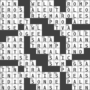 ACROSS 1. The 18th letter of the Arabic alphabet 4. Water source 8. Frolic 12. Greek god of love 14. Eskimo relative 16. Butter sub 17. Loose flowing garment 18. Complicated, petty procedures 20. An arm off of a larger body of water 22. Adept person 23. Had dinner 24. Compass dir. 25. Leather borer 28. Federal power corp. 30. Double curve, resembling the letter S 31. Learning spot: Fr. 35. At a great distance 37. "Two Mules for Sister ____" 40. SW Asia republic 41. Object of repulsion 42. _____ steamer (cargo ship) 44. Raised platform 45. International (abbr.) 46. Anneal 47. Indiana (abbr.) 48. Annoying sound 50. Ketch in the Levant 52. Period 54. Symbol (abbr.) 55. Girls' org. (abbr.) 58. Shallow baking pan 61. Retirement account (abbr.) 63. Components 65. Pleas 70. Oceans 71. Singer Brickell 72. Something which is sent 73. Diluted with white 74. Olfactory organ 75. Vertical spar for supporting sails 76. Nine, plus one DOWN 1. Nest on high 2. Removes the wrinkles 3. Having high moral qualities 4. Armed conflict 5. Biblical high priest 6. Part of a journey 7. Mass 8. Friend of Pooh 9. Spanish pot 10. Rendezvous 11. Introduce or present, as a question 13. Perceive with the eye 15. Small pie 19. Be footloose 21. Label 26. 270 degrees 27. Memorize 29. Being or containing an acid 30. Threatening words 32. NW Algerian seaport 33. Put down 34. Followers of ems 35. Papal veil 36. Against 38. Actress Charlotte 39. Collect or gather 41. Storage container 43. Romp 49. One of the Great Lakes 51. Naughty child 53. Caspian sea tributary 55. Relatively large 56. Having lost freshness 57. NE Netherlands city 58. Adolescent 59. Southeast Asian peninsula 60. Nuclear Threat Initiatives 62. Smallest unit of an element 64. Viper 66. To sift 67. _ tizzy (2 wds.) 68. Begley and Asner 69. Arrange properly for use