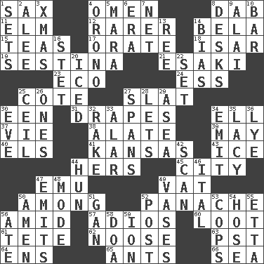 ACROSS 1. Saxophone 4. Presage 8. Small moist lump or mass 11. Shade tree 12. More valued for its uncommonness 14. Actor Lugosi 15. Afternoon social gatherings 17. Speak pompously 18. Austrian river, tributary to the Danube 19. French poetic form 21. 1973 Nobel Price Winner (Physics) Leo 23. Environmental prefix 24. Curvy letter 25. ____ d'Azur (French Riviera) 27. Narrow board 30. Car or cant ending 31. Window treatments 34. Pipe bend 37. Compete 38. Having winglike extensions 39. Can I? 40. Raised railways 41. Sunflower state 43. Frozen water 44. Possessive pronoun 45. Municipality 47. Australian flightless bird 49. Large container 50. Amid 52. Flamboyance 56. Among 57. Goodbye (Sp.) 60. Plunder 61. Wig 62. Trap for birds or small mammals 63. Pacific Standard Time (abbr.) 64. Followers of ems 65. Pismires 66. Ocean DOWN 1. Puts into a specified state 2. Toward shelter 3. Dec. holiday 4. U. of Maine site 5. Hindu Mythology: god of death 6. Period 7. Fish or hair follower 8. Writing tables 9. Jai _ 10. Soap unit 13. Portuguese money of account (variant) 14. Prejudice 16. Proofreading order 20. On the rocks 22. Put into a specified state 25. To provide with a ceiling 26. Singles 27. Connects, as a bridge 28. Allows 29. Toward the sea 30. First lady 32. Immoral or dissolute person 33. Having or resembling wings 34. Send forth 35. Made of lace 36. Sodium hydroxide 42. Skim 44. Attila the _ 46. Slanted text style (abbr.) 47. Gives off 48. Method 49. Flower holders 50. So be it 51. Separate the seeds from cotton 52. Mail 53. 911 reaches them 54. Flexible conduit 55. Singer James 56. Had dinner 58. ___ good deed 59. Electrically charged atom