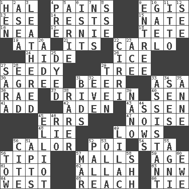 ACROSS 1. Actor Linden 4. Aches 9. The front part of a cuirass 13. Compass dir. 14. Musical pauses 15. Nathan's nickname 16. Teachers' org. 17. Bert's buddy 18. False hair 19. "One Day ___ Time" 21. ___ a Wonderful Life 22. Monte _, Las Vegas Hotel/Casino 24. Flintstone garb 26. Frozen water 27. Shabby and untidy 29. Family _ (genealogy) 30. Match 31. Fermented drink made from hops 33. White ___ sheet 36. Actress Charlotte 37. Popular '50s hangout 40. Elected rep. 41. Say or write further 42. Arabian gulf 43. NE Netherlands city 45. Blunders 47. Annoying sound 48. Untruth 49. Coldest temperatures 50. Bodily heat indicating an inflammation 52. Luau course 54. R.R. building 56. Native american tent (variation) 57. Shopping centers 59. Personal question 61. Von Bismarck 62. Assad's deity 63. Compass dir. 64. 270 degrees 65. Arrive at 66. Make a knot DOWN 1. Layer 2. Toward the sea 3. Resembling or made to resemble leather 4. Before (prefix) 5. Nest on high 6. Is not 7. Nuclear Threat Initiatives 8. Compass dir. 9. Main course 10. Highlander 11. "Tell ____ the Marines!" 12. Observe 20. Helper 22. High-altitude cloud 23. Adept person 25. Colored 27. "Two Mules for Sister ____" 28. Mild oath 29. Adolescent 31. Auction offers 32. Night before a holiday 33. Helper 34. Observes 35. Queen of England 1702-14 38. More valued for its uncommonness 39. Billionth: prefix 44. Sty mamas 45. American author Paul (1891-1958) 46. River (Sp.) 49. Pale purple color 50. Quote 51. Flats, for short 52. Diluted with white 53. Rounded earthenware pot or jar 55. Hindu god of fire 56. Pull behind 57. Impair 58. Quiet! 60. She-sheep