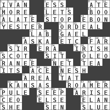 ACROSS 1. "Terrible" tsar 5. Double-curved letter 8. Had dinner 11. Greater amount 12. Allows 14. Oct. 31 cry 15. Having winglike extensions 17. Obstruct or block passage 18. Inky black, to poets 19. Next before 21. Severe or trying experience 23. Experiment locale 25. Highlander 26. "____ silly question..." 27. And so on (abbr.) 28. At a great distance 31. Title for a knight 33. Period 35. From or relating to Ireland 37. Native of Scotland 38. Be seated 40. Butter sub 41. Indian princess (variant) 43. Fish or hair follower 45. Afternoon social gathering 46. ___ a Wonderful Life 47. Adept person 50. Soft 52. Length times width 53. Make lace 54. Sunflower state 56. Wanderer 61. Whimper 62. Ooze 65. Originate 66. Corporate head (abbr.) 67. Otherwise 68. Liveliness 69. A female animal or person 70. Elected rep. 71. Change direction abruptly DOWN 1. "If ____ say so..." 2. Short-tailed, large-bodied rat 3. Ancient river in northeast Turkey 4. Remaining after all deductions 5. Raised railways 6. Put into a specified state 7. Moe Howard, for one 8. Swedish rock group 9. Utensil 10. Age 13. Small fatty European fish 16. Snakelike fish 18. Snakelike fish 20. Immoral or dissolute person 22. Tenth: prefix 24. Long, evenly shaped pieces 26. Johnson of "Laugh-In" 28. Do some clerical work 29. Toward the sea 30. 17th letter of the Greek alphabet 31. Get outta here! 32. Charged atoms 34. The 18th letter of the Arabic alphabet 36. Writer of Portnoy's Complaint (1969) 37. Indian title of respect (Mr.) 39. Portable shelter 42. Hearing organs 44. Lacerate 48. Stop 49. Artist's stands 51. Portico 52. A saturated hydrocarbon 54. Malaysian steamed pastry 55. Medicinal plant 57. Ancient Greek god of war 58. Place where flour is made 59. He sold his birthright 60. French philosopher Descartes 61. Personal Computers (abbr.) 63. Compass dir. 64. Animal enclosure