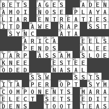 ACROSS 1. Wagers 5. Matures 9. Arabian gulf 13. Mine, in Marseilles 14. Sense of smell 15. Beach, in Buenos Aires 16. One who doesn't tell the truth 17. Pleas 19. It would 20. Deep reverence 21. Hit sharply and swiftly 22. Fast jet (abbr.) 23. Synchronize (abbr.) 25. "One Day ___ Time" 26. N. Chile seaport 30. Snakelike fish 34. Hangs 35. Toward shelter 36. Canvas cover 39. Indian state 42. _ gin 43. Leg joint 44. First name in cosmetics 46. Wrote a lyric poem 47. Rhinal 48. Compass dir. 51. Fast planes 54. Call ___ day 57. For each 58. Elect 60. Symbol (abbr.) 62. Pieces 65. Hindu Mythology: god of death 66. Voters do this 67. Puts into a specified state 68. Prepare for publication 69. Habitations of wild animals 70. A blast of a horn 71. Afternoon social gatherings DOWN 1. Indonesian resort city 2. Gives off 3. Sycophant 4. Title for a knight 5. Afresh 6. Went 7. Eastern Standard Time (abbr.) 8. Spanish missionary in California 9. Keyboard modifier key 10. Raised platform 11. Snake ____ (dice throw) 12. Political cartoonist Thomas 15. Dad 18. Erode 20. 43,560 square feet 24. Slept 27. _ tizzy (2 wds.) 28. Music discs 29. NE Netherlands city 30. Artist's stands 31. Pipe bend 32. Lion 33. Observe 36. Ring climax 37. Also 38. To sift 40. White ___ sheet 41. Mountains (abbr.) 45. Compass direction 48. Blemish 49. Elected rep. 50. Obtain by seizing forcibly or violently 52. Sadhe (variant) 53. Damascus' land 54. On the rocks 55. Lacquered or enameled metalware 56. So be it 58. Von Bismarck 59. Inconspicuous attention getter 61. Floor coverings 63. Personal Computers (abbr.) 64. Modern: prefix 65. Was introduced to