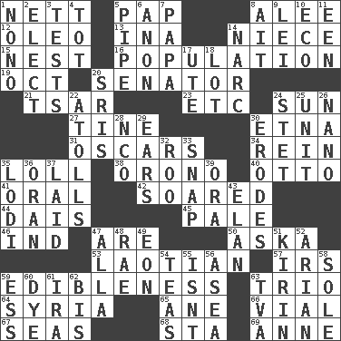 ACROSS 1. Remaining after all deductions 5. Infant food 8. Toward shelter 12. Butter sub 13. _ tizzy (2 wds.) 14. Sibling's daughter 15. A home for chicks 16. Census information 19. Sep. follower 20. Elected representative 21. Russian ruler of old 23. And so on (abbr.) 24. Player for Phoenix 27. Prong on a fork 30. Inactive volcano in Sicily 31. Motion picture awards 34. It's straight from the horse's mouth 35. Hang loosely or laxly 38. U. of Maine site 40. Von Bismarck 41. Relating to the mouth 42. Flew 44. Raised platform 45. Diluted with white 46. Indiana (abbr.) 47. "We ___ not amused" (Victoria) 50. "____ silly question..." 53. Of or relating to Laos or its people 57. Big collection agency 59. The property of being fit to eat 63. Musical group of three 64. Damascus' land 65. A saturated hydrocarbon 66. Small bottle 67. Oceans 68. R.R. building 69. Singer Murray DOWN 1. Words to Nanette 2. Voters do this 3. Trials 4. Small child 5. Corncob 6. At once, immediately (arch.) 7. Dad 8. Small island 9. Flowery wreath 10. Environmental prefix 11. Car or cant ending 14. Drug cop 17. Shoshoni 18. Car dealer's back yard 20. Indian titles of respect 22. Ringlike coral islands and reefs 24. Proofreading order 25. A single undivided whole 26. Billionth: prefix 28. Non-commissioned officer (abbr.) 29. Hearing organs 30. Eats (away) 32. Friend of Pooh 33. Fastener 35. Farming town in central California 36. NW Algerian seaport 37. Put down 39. Mouth or opening 43. Liveliness 47. Silent film actress Nazimova 48. Actress Charlotte 49. Age 51. Japanese brewing company 52. Believer in; advocate of (suffix) 54. Afternoon social gatherings 55. Is not 56. At sea 58. Not divided or shared with others 59. Curvy letter 60. Color 61. Lyricist Gershwin 62. Altar cloth linen 63. Federal power corp.