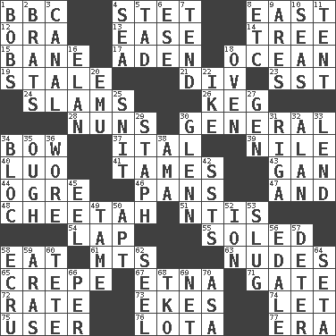 ACROSS 1. English channel? 4. Proofreading order 8. Compass direction 12. Mouth or opening 13. Relaxation 14. Relationship diagram 15. Object of repulsion 17. An important port of Yemen 18. Sea 19. Having lost freshness 21. HTML Container Element 23. Fast jet (abbr.) 24. Shuts with force 26. Barrel 28. Religious women 30. Commissioned military rank 34. Ribbon knot 37. Slanted text style (abbr.) 39. The longest river in the world 40. Nilotic language 41. Domesticates 43. Separate the seeds from cotton 44. Legendary monster 46. Baking dishes 47. Added to 48. Leopard's kin 51. Nuclear Threat Initiatives 54. Pet locale 55. Having a sole or soles 58. Consume 61. Mountains (abbr.) 63. Unclothed pictures 65. Streamer paper 67. Inactive volcano in Sicily 71. Yard entry 72. Assign a rank or rating to 73. Supplements with great effort 74. Allow 75. One who uses or employs something 76. Globular water bottle used in Asia 77. Epoch DOWN 1. Moves up and down 2. Naughty children 3. Lessep's creation 4. Ocean 5. Small boy 6. Compass dir. 7. Watch over 8. And so on (abbr.) 9. Ancient Greek god of war 10. Oceans 11. Portable shelter 16. Liveliness 18. Baking chamber 20. Australian flightless bird 22. Eisenhower's nickname 25. In a ____ (agitated or irritated) 27. Commissioned mil. rank 29. Staphylococcus 30. American astronaut and politician John 31. Capital of Latvia 32. Actor Alda or Thicke 33. Grant temporary use of 34. Coalition 35. Ending for "Through" and "Enough" 36. Had on 38. Housemaid (var.) 42. Fast planes 45. Snakelike fish 49. Not wild 50. Fitting 52. Electrically charged atom 53. Snaillike creature with no shell 56. Peak District village in England 57. Prevent from occurring 58. Shade of tan 59. Ancient river in northeast Turkey 60. False hair 62. Sew up the eyelids of hawks and falcons 64. Bristle 66. For each 68. Ring climax 69. Fish or hair follower 70. White ___ sheet
