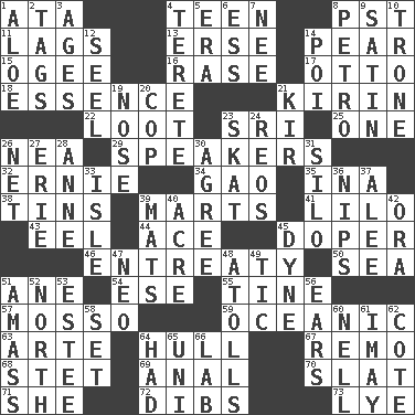 ACROSS 1. "One Day ___ Time" 4. Adolescent 8. Pacific Standard Time (abbr.) 11. Fails to keep up a pace 13. Celtic language 14. Lightbulb-shaped fruit 15. Double curve, resembling the letter S 16. Raze (variant) 17. Von Bismarck 18. Substance 21. Japanese brewing company 22. Spoils 23. Indian title of respect (Mr.) 25. Single 26. Teachers' org. 29. Orators 32. Bert's buddy 34. E Mali city 35. _ tizzy (2 wds.) 38. Metal containers 39. Shops 41. _ and Stitch 43. Snakelike fish 44. Adept person 45. Drug addict 46. Plea 50. Ocean 51. One (Scot) 54. Compass dir. 55. Prong on a fork 57. With motion or animation 59. Pertaining to the sea 63. Johnson of "Laugh-In" 64. Frame or body of a ship 67. San ____ (Riviera town) 68. Proofreading order 69. Of or related to the anus 70. Narrow board 71. A female animal or person 72. Claim 73. Sodium hydroxide DOWN 1. _ vera 2. Labels 3. Ripens 4. Cylindrical with tapered ends 5. Epoch 6. Double-curved letter 7. Born 8. Stone: prefix 9. Smooth fabric 10. Marketplace scale 12. Stitch closed the eyes of (a falcon) 14. Luau course 19. Olfactory organ 20. Police officer (slang) 21. Apertif with cassis 23. Three-handed card game 24. Vintage cars 26. Fish or hair follower 27. 4th largest of the Great Lakes 28. Queen of England 1702-14 30. Match 31. Grain storage tower 33. Capri or Wright 36. Pinches, bites 37. Toward shelter 39. Floor protectors 40. 1/640 square mile 42. Mouth or opening 45. Unit of force 47. Modern: prefix 48. Ringlike coral islands and reefs 49. Nervous spasm 51. Collect or gather 52. _ pole 53. First name in cosmetics 56. Hearing organs 58. Arrange properly for use 60. 1994 drama film starring Jodie Foster 61. "If ____ say so..." 62. ____ d'Azur (French Riviera) 64. Possessed 65. Single; one (prefix) 66. Experiment locale