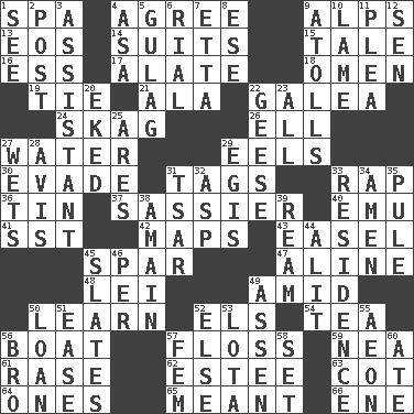 ACROSS 1. Health resort 4. Match 9. High mountains 13. Greek goddess of the dawn 14. Sets of matching outer garments 15. Lie 16. Double-curved letter 17. Having winglike extensions 18. Sign of things to come 19. Neckwear 21. Insect wing 22. An organ shaped like a helmet 24. Heroin 26. Pipe bend 27. Wetness 29. Snakelike fish 30. Elude 31. Labels 33. Hit sharply and swiftly 36. Shallow baking pan 37. More disrespectful 40. Australian flightless bird 41. Fast jet (abbr.) 42. Atlas contents 43. Artist's stand 45. Practice fight 47. Place in a line 48. Flowery wreath 49. Among 50. Acquire or gain knowledge or skills 52. Raised railways 54. Afternoon social gathering 56. Water vessel 57. Soft thread for cleaning between teeth 59. Teachers' org. 61. To erase 62. First name in cosmetics 63. Small bed 64. Singles 65. Intended 66. Compass dir. DOWN 1. Observe 2. Mail 3. Helper 4. White ___ sheet 5. Russian prison camp 6. Monetary unit of Yemen 7. Singer James 8. Compass dir. 9. Ringlike coral islands and reefs 10. Unable to walk 11. Entreaty 12. Elected rep. 20. Made supply last 22. Honkers 23. 100% 25. Ancient Greek god of war 27. Soaks 28. Opinion 29. The front part of a cuirass 31. Russian ruler of old 32. Cleo's killer 33. Home 34. So be it 35. Whimper 38. At full speed 39. 480, 500 or 516 sheets of paper 44. Came down and settled, as after flight 45. Chalkboards 46. For each 49. NE Netherlands city 50. Grant temporary use of 51. Comfort 52. Otherwise 53. Globular water bottle used in Asia 55. A really long time 56. Sis' sibling 57. Opposite of masc. 58. Put into a specified state 60. Had dinner