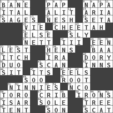 ACROSS 1. Object of repulsion 5. Infant food 8. California wine valley 12. Slanted text style (abbr.) 13. Set down 15. Operatic vocal solo 16. Gurus 18. Tender 19. Bristle 20. Compete 22. Leopard's kin 24. Otherwise 26. Cunning 27. Remaining after all deductions 28. One more than two 29. Car or cant ending 32. For fear that 35. Coop moms 37. Sound made by sheep 38. Hankering 39. Lyricist Gershwin 40. Rowboat 41. Superhero pair 42. Glance over 43. Lodging establishments 44. Be seated 45. It is 46. Snakelike fish 49. "Barney Miller" actor Jack 50. Carrot, for example 51. Fools 55. Non-commissioned officer (abbr.) 56. "Corrida" creature 57. Baby bed with high sides 59. Metal shackles 63. Austrian river, tributary to the Danube 64. Not divided or shared with others 65. Relationship diagram 66. Portable shelter 67. Boy, to dad 68. Jazz singing style DOWN 1. Altar cloth linen 2. _ moment's notice (2 wds.) 3. Tired old horse 4. Veterans Day date 5. Baking dish 6. Actor Baldwin 7. Expression of disdain 8. Difficult 9. Length times width 10. Essential or central part 11. Auto club (abbr.) 14. College paper 17. Drop; flow; fall 21. Eastern Standard Time (abbr.) 23. Connecticut Ivy Leaguer 25. Value system 28. More lacking in sense or substance 29. Inky black, to poets 30. Merit 31. Negative votes 32. Flaplike coverings 33. Needle case 34. Highlander 36. Period 40. What propaganda does 42. Unemotional ones 45. Electrically charged atom 47. Age 48. Venues 49. Derisive sound 51. Characteristic smell of wine 52. SW Asia republic 53. Greek god of love 54. Grain storage tower 56. Teat (slang) 58. Benjamin's nick name 60. The grampus (Milton) 61. Teachers' org. 62. Put into a specified state