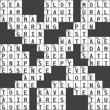 ACROSS 1. Ocean 4. Narrow, elongated depression 8. Undercover agent 12. Scottish cap 13. "Change" in Tahitian 14. Mountain range 15. Odor 18. A single undivided whole 19. Plant excrements 20. Catching in a trap 22. Animal enclosure 23. Smile widely 24. Eastern Standard Time (abbr.) 25. Ingest 26. Electrical Measurement 30. The 18th letter of the Arabic alphabet 33. Failure 36. Dutch treat 37. Plant holders 39. Unit of force equal to gravity 40. Suttee (variant) 41. Sever or remove by pinching or nipping 42. Not well drained, as in land 44. Was introduced to 45. Core 47. Night before a holiday 50. Cuckoo 51. Old wives' tales, e.g. 53. Supplement with great effort 54. Crying or shouting loudly 57. Lacquered or enameled metalware 59. Polynesian shrub of the pepper family 61. Rends 63. SW Saudi Arabia district 64. Ancient Greek god of war 65. The 19th letter of the Greek alphabet 66. Moves 67. Trial 68. Compass dir. DOWN 1. R.R. building 2. Hearing organs 3. Amid 4. Surprise greatly 5. Long (Scottish) 6. Fr. "Yes" 7. Teat (slang) 8. French bagpipes 9. Northwest Algerian city 10. Infant locale 11. Raised railways 16. Female horse 17. Operatic vocal solo 21. International (abbr.) 22. Pacific Standard Time (abbr.) 24. Hearing organ 26. Shed a tear 27. First man 28. Yard entry 29. Send forth 30. Domed church section 31. Charged particles 32. Nuclear Threat Initiatives 34. Double curve, resembling the letter S 35. Observe 38. Orators 42. _-fi 43. Shout 46. Compass dir. 48. Electrical Unit 49. 4th largest of the Great Lakes 52. Maternal 53. Writer Wiesel 54. Jacques Cousteau's middle name 55. Compass direction 56. Pate de foie ____ 57. Label 58. Bear (Spanish) 59. Krazy ___ of comics 60. "We ___ not amused" (Victoria) 62. Take to court