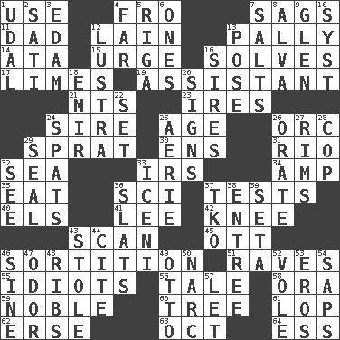 ACROSS 1. Purpose 4. Back 7. Droops 11. Male parent 12. (Had) reclined 13. Friendly 14. "One Day ___ Time" 15. Goad 16. Finds the solution 17. Citrus fruits 19. Helper 21. Mountains (abbr.) 23. Angers 24. The founder of a family 25. Personal question 26. The grampus (Milton) 29. Small fatty European fish 30. Followers of ems 31. _ de Janeiro 32. Ocean 33. Big collection agency 34. Electrical Unit 35. Ingest 36. _-fi 37. Trials 40. Raised railways 41. Area sheltered from the wind 42. Leg joint 43. Examine minutely or intensely 45. Baseball player Mel 46. Drawing lots 51. All-night dance parties 55. Foolish or stupid persons 56. Falsehood 58. Mouth or opening 59. Impressive in appearance 60. Family _ (genealogy) 61. Trim (branches) 62. Celtic language 63. Sep. follower 64. Double-curved letter DOWN 1. Hereditary estate 2. Suttee (variant) 3. Dutch treat 4. At a great distance 5. Port city in Latvia 6. Singles 7. Table seasonings 8. Inventor's middle name 9. Small, secluded valley 10. System (abbr.) 12. A period of five years 13. Airs 16. Fathers 18. Independent ruler or chieftain 20. Signals 22. Arrange properly for use 24. Arguments over trivial matters 25. Nest on high 26. Speak pompously 27. Basketball hoops 28. Police officer (slang) 29. Lick closed 32. Perceive with the eye 33. Ancient Celtic tribe of eastern Britain 36. Narrow boards 37. Ring climax 38. Main course 39. Stalk of a moss capsule 43. Took without asking 44. Quote 46. Trig term 47. Scent 48. Chest bones 49. Von Bismarck 50. Drug cop 52. Grand slam 53. Greek god of love 54. Plant excrements 57. Allow