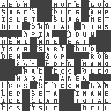 ACROSS 1. Period of immesurable duration 5. Residence 9. Thick or sticky substance 12. Gurus 14. Cassini of fashion 15. Electrical Unit 16. Small island 17. Volcanic refuse 18. Was introduced to 19. To separate or throw off 20. Severe or trying experience 23. Airtight sealed metal containers 24. Capital of Western Samoa 25. Goddess of spring and wife of Bragi 27. Painter Guido (1575-1642) 30. Madame (abbr.) 32. Erode 33. Austrian river, tributary to the Danube 34. Indian skirt 36. Superhero pair 38. Lair 39. Republican Party 40. Director Reiner 43. Personal question 46. Genesis locale 48. Billionth: prefix 49. Actress Charlotte 51. Environmental prefix 52. Butter sub 53. Hindu Mythology: god of death 54. Afresh 56. Greek god of love 58. "Cheers" or "Ellen" 61. Separate the seeds from cotton 64. Directed 65. Bristle 66. Silly 68. Binary compound 69. Burrowing marine mollusk 70. Add up to 71. Greek goddess of the dawn 72. Capri or Wright 73. Small valley DOWN 1. SW Saudi Arabia district 2. Comfort 3. Stare 4. Born 5. Stockings 6. Water jar 7. Ear of corn 8. Oval reproductive body of a fowl 9. Street urchin 10. Sign of something about to happen 11. Elects 13. Halt 21. Basketball hoops 22. Break 23. Ballerina skirt 24. Wind 26. June honoree 27. To free from 28. Compass dir. 29. Grandmother 31. Eat (away) 35. Medicinal drug used to evoke vomiting 37. Spoken 41. Single 42. Surprise greeting 44. Pate de foie ____ 45. Hearing organ 47. Words to Nanette 48. Immediately 50. Artist's stands 53. Methods 55. Give off 56. Writer Wiesel 57. Do over again 59. Slanted text style (abbr.) 60. Not wild 61. Yard entry 62. Of or related to the anus 63. 1994 drama film starring Jodie Foster 65. _-fi 67. Allow head to fall sleepily
