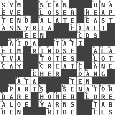 ACROSS 1. Symbol (abbr.) 4. Glance over 8. Heredity factor (abbr.) 11. Night before a holiday 12. Failure 14. Pile 15. Watch over 17. Having winglike extensions 18. Compass direction 19. Nineveh was its capital 21. Honor 23. Car or cant ending 24. Music discs 25. Opera by Verdi 27. Jacques of French films 30. Shade tree 31. Full of chinks, cracks, or crevices 34. Wing 37. Federal power corp. 38. Lugs 39. Car dealer's back yard 40. Island 41. Make 43. A saturated hydrocarbon 44. "Mermaids" star 45. Mild oath, euphamism for damn 47. _ moment's notice (2 wds.) 49. Nine, plus one 50. Components 52. Legislator 56. Have the gumption 57. Simpsons dad 60. Old wives' tales, e.g. 61. _ vera 62. Tall tales 63. Bar bill 64. Benjamin's nick name 65. Travel on an animal 66. Raised railways DOWN 1. Stalk of a moss capsule 2. Jacques Cousteau's middle name 3. Not women's 4. Killed 5. Root beer relative 6. White ___ sheet 7. Fish or hair follower 8. Allots cards 9. Political cartoonist Thomas 10. Fitting 13. Portuguese money of account (variant) 14. Froth on beer 16. Colored 20. Tail end 22. One more than ninety 25. Inventor's middle name 26. "If ____ say so..." 27. Carrier 28. At sea 29. Trial 30. And so on (abbr.) 32. Hankering 33. Greater amount 34. Actor Alda or Thicke 35. Having great length 36. Had dinner 42. Locale of original sin 44. Domesticated feline 46. Of or related to the anus 47. Composer Copland 48. Family _ (genealogy) 49. Laconic 50. Light colored 51. Like a shrinking violet 52. Post 53. Haul 54. Of the mouth 55. Confederate soldiers (slang) 56. Pat or tap gently 58. Boat paddle 59. Medical imaging device (abbr.)